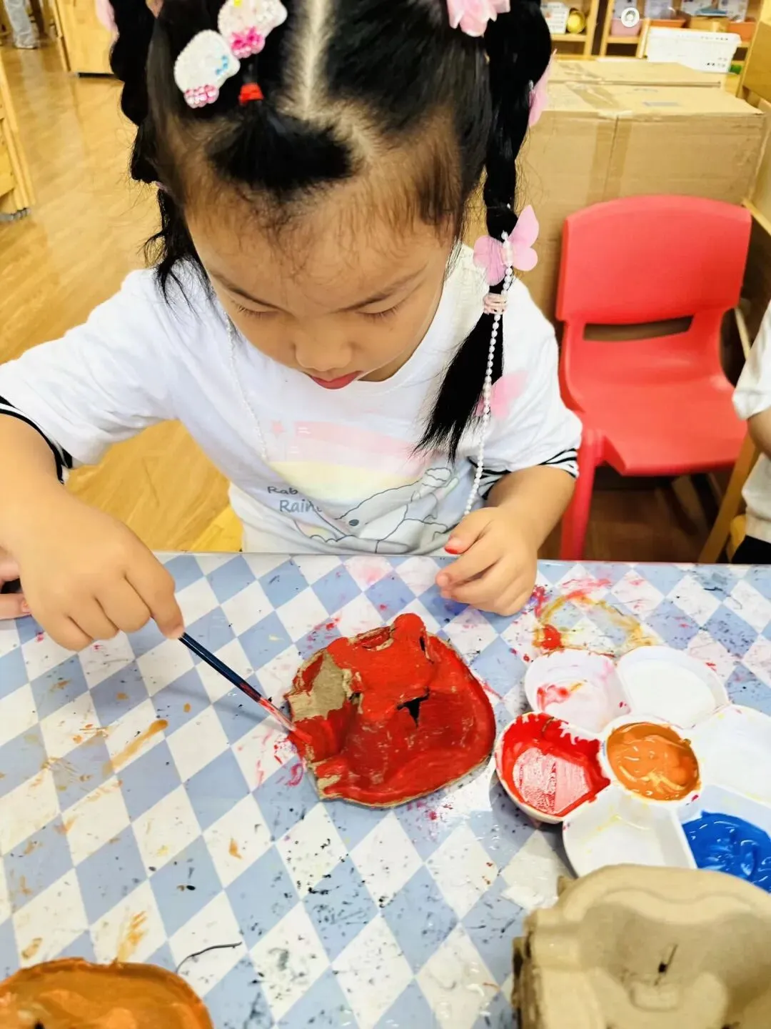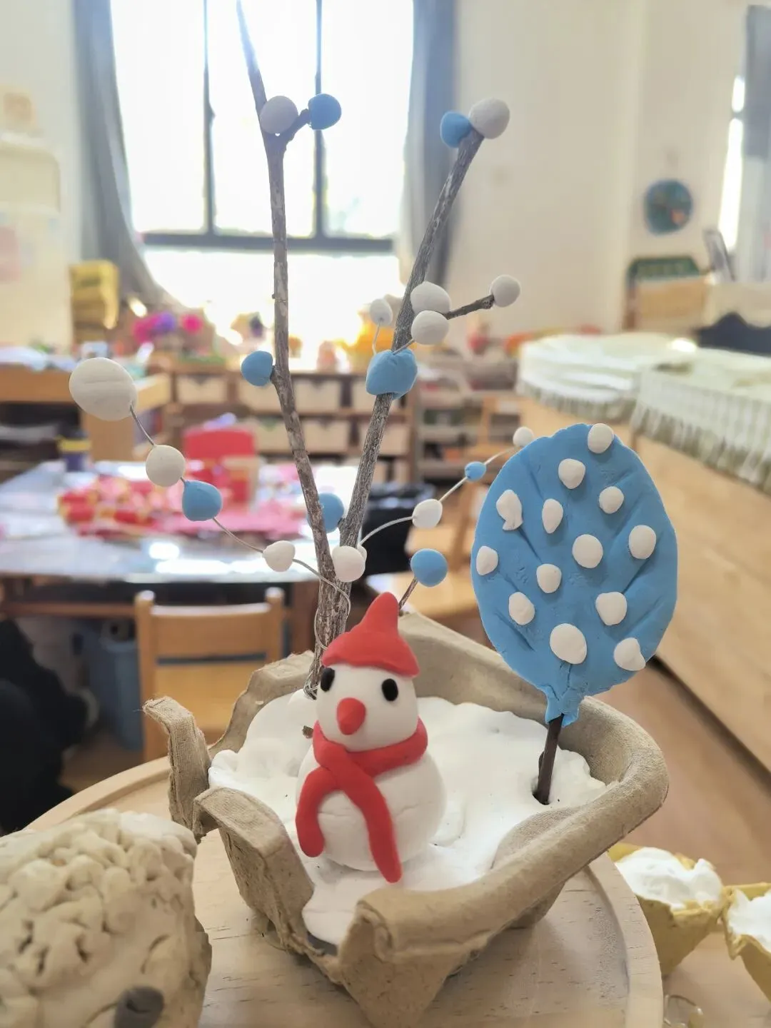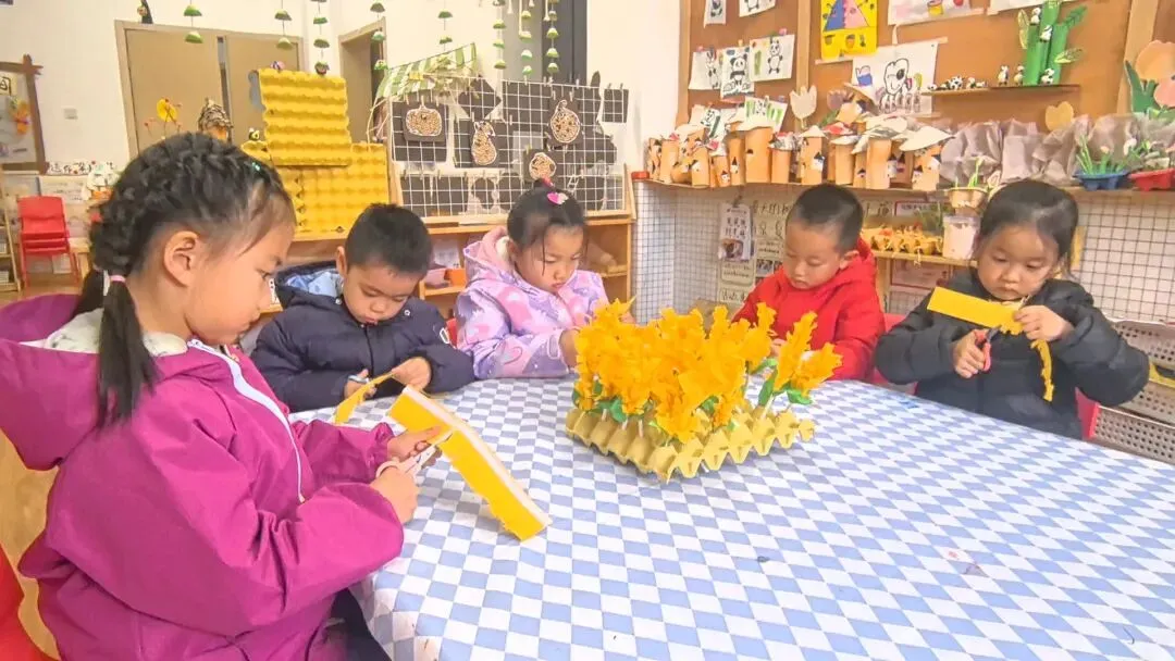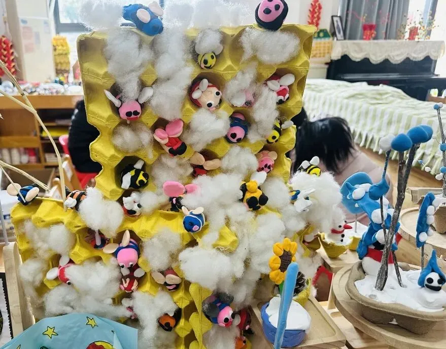 可爱的动物主题活动中,孩子们以超轻黏土搭配鸡蛋托盘,发挥创意搭建出温馨的蜜蜂家园。临近冬季,大家贴心地用棉花为小蜜蜂“保暖”,助力它们过冬。活动中,孩子们不仅锻炼了手部精细动作与材料运用能力,更在创作中了解动物的生活习性,萌发了关爱小动物的共情心,在充满童趣的实践里感受生命与自然的美好,深化了对主题的理解与感悟。