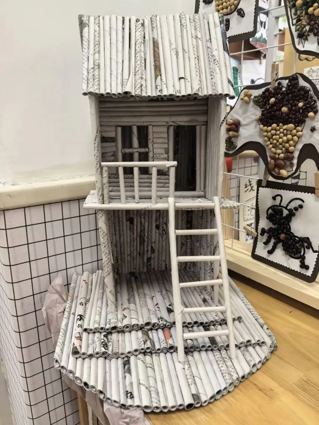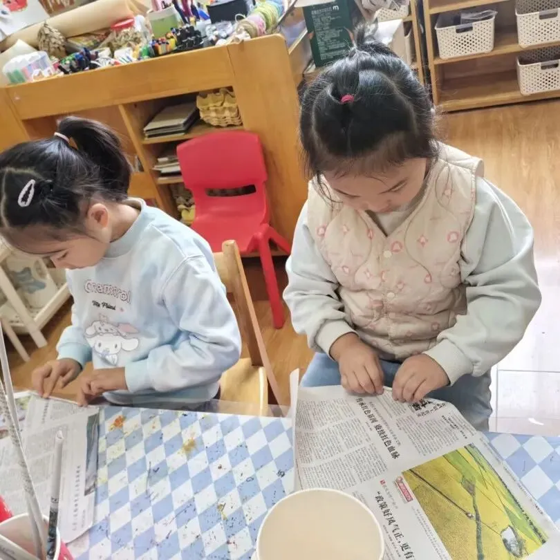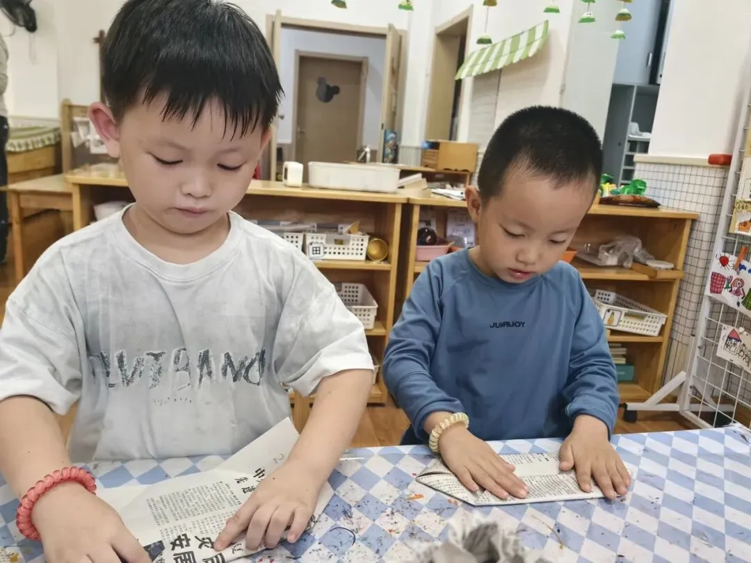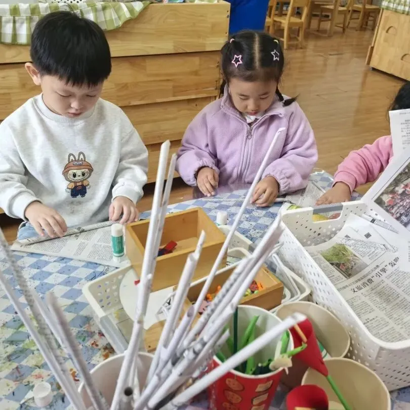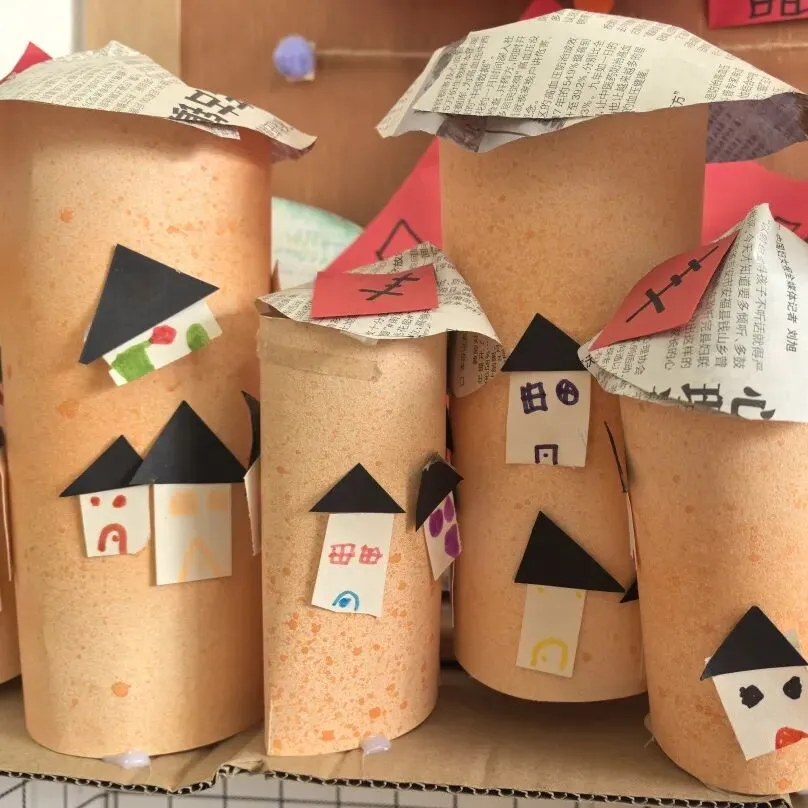 宝贝们带来报纸,一起动手卷出一根根报纸棍,再齐心协力把纸棍粘贴拼接,搭出了创意满满的报纸小楼!每一根报纸棍都藏着小手的巧思,每一处拼接都凝聚着合作的快乐,废旧报纸变身有趣建筑,在动手探索中感受创造与合作的美好~~
