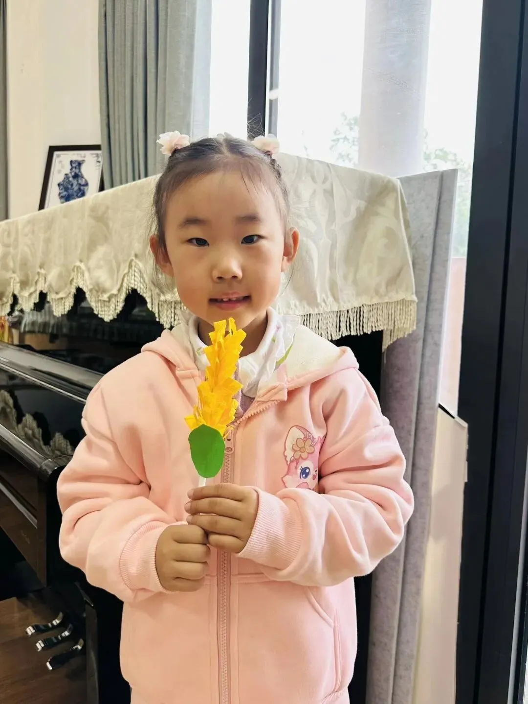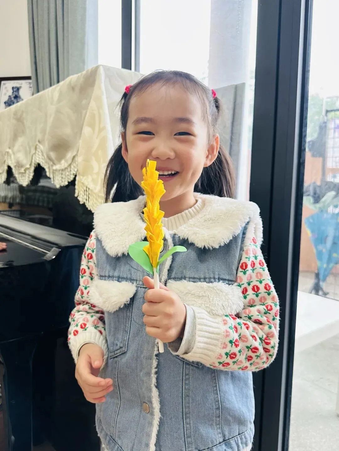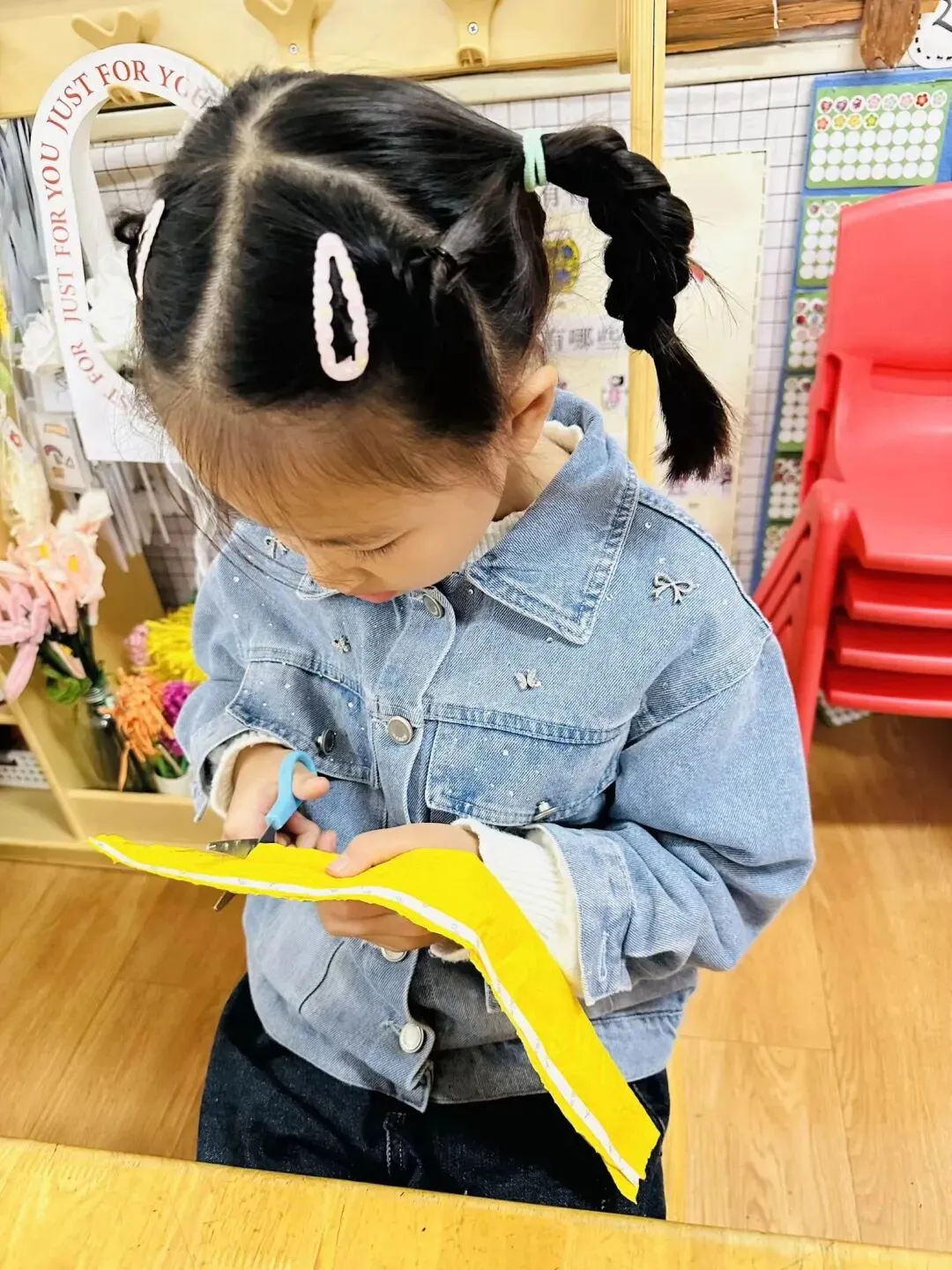 宝贝们用金黄色的手工纸,通过折、剪、卷、贴等多种技能,制作出了这片充满秋意的“麦田”。每一片金黄的麦叶、每一颗饱满的麦穗,都是孩子们对秋天丰收的想象。这不仅锻炼了小手的精细动作,更让宝贝们在创作中感受到了秋日田野的美好。