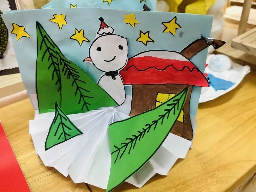 孩子们围绕“雪天的房子”展开创意创作。大家将白色彩纸反折成扇状模拟皑皑雪地,手绘剪裁绿色小树点缀其间,以蓝色彩纸为背景,粘贴可爱雪人,再添上房子与星星等元素,勾勒出冬日美景。活动中,孩子们熟练运用折、画、剪、贴等技能,感知色彩与造型的搭配美感,在沉浸式创作中感受冬季特色,既锻炼了动手能力与想象力,也深化了对冬季节景的观察与热爱,收获了满满的创作乐趣与成就感。