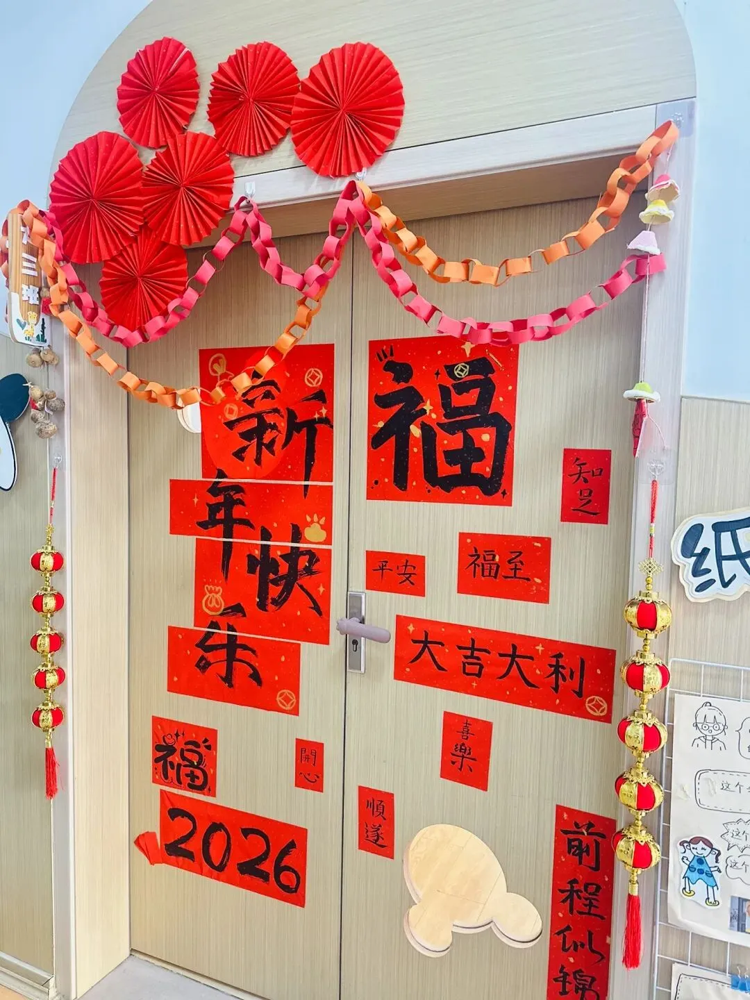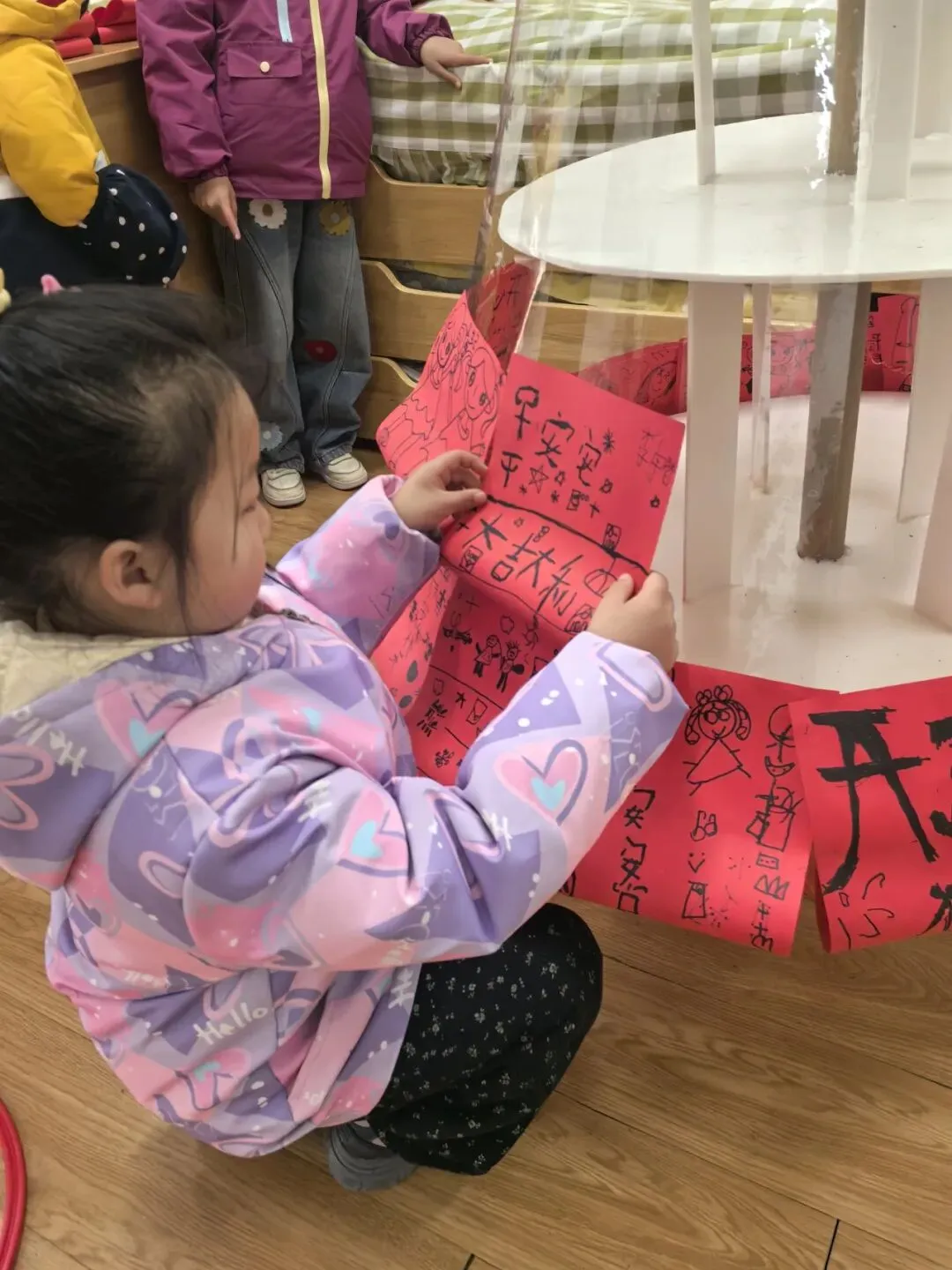 大三班宝贝们巧手制作新年装饰啦!红纸正反折成小巧扇面,拼贴成圆圆的团扇,寓意团团圆圆;彩纸条相互粘贴,连成长长的纸圈长条,象征长长久久。孩子们还认真画出新年祝福语,用稚嫩的话语诉说满心祝福……在动手创作中感受新年氛围,把美好心愿藏进每一件手作里,迎接新年的到来!