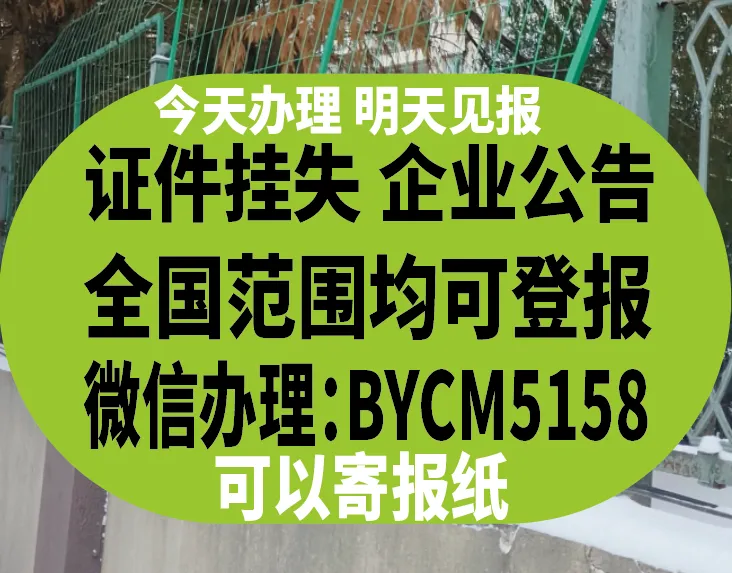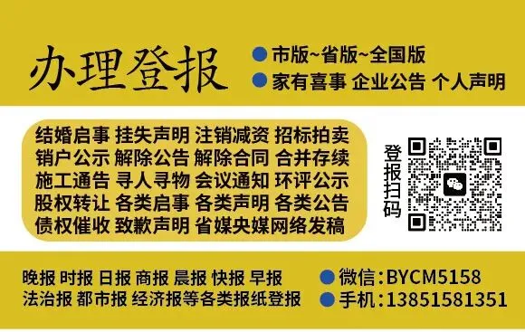 设有企业公告、寻人启事、商务招商房产信息、招聘求职、遗失声明等登报位置。可联系:13851581351,微信:BYCM5158.