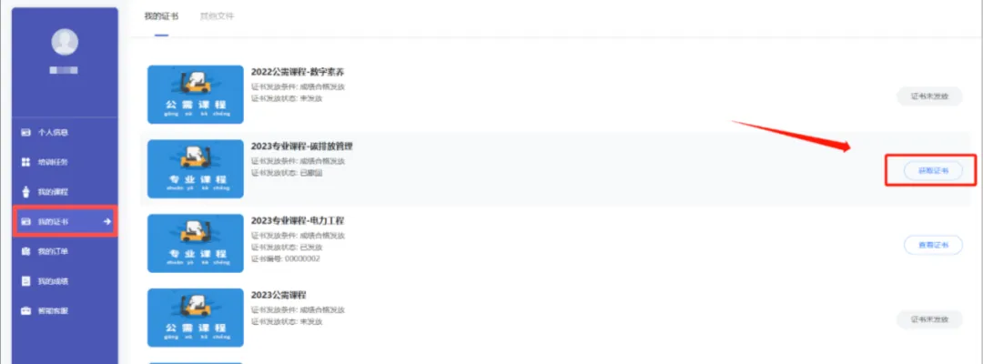 学习网址:https://www.xzjxjy.com/ 二、点击培训任务模块,按对应年份选择公需课程或专业课程,核对信息无误后完成报名操作。四、选定对应课程后,点击进行学习,即可进入课程学习页面五、课程学习及考核通过后,点击左侧菜单栏我的证书,选定已完成的对应课程,点击获取证书即可。