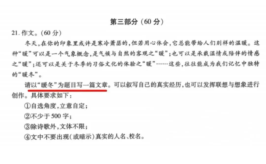 难度中等偏上。基础部分中等偏易,综合阅读部分为核心难点,注重文本理解与综合运用。作文题目“暖冬”贴近生活,易立意但难出彩。