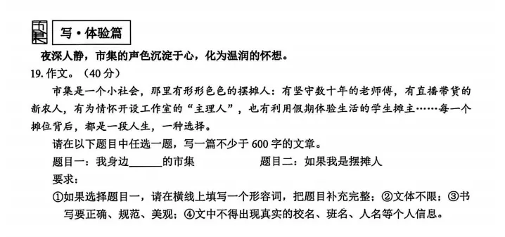 难度中等偏上。以“市集”为主题贯穿,注重基础、高阶思维及知识在生活与传统文化的综合运用,体现“大语文”考查理念。