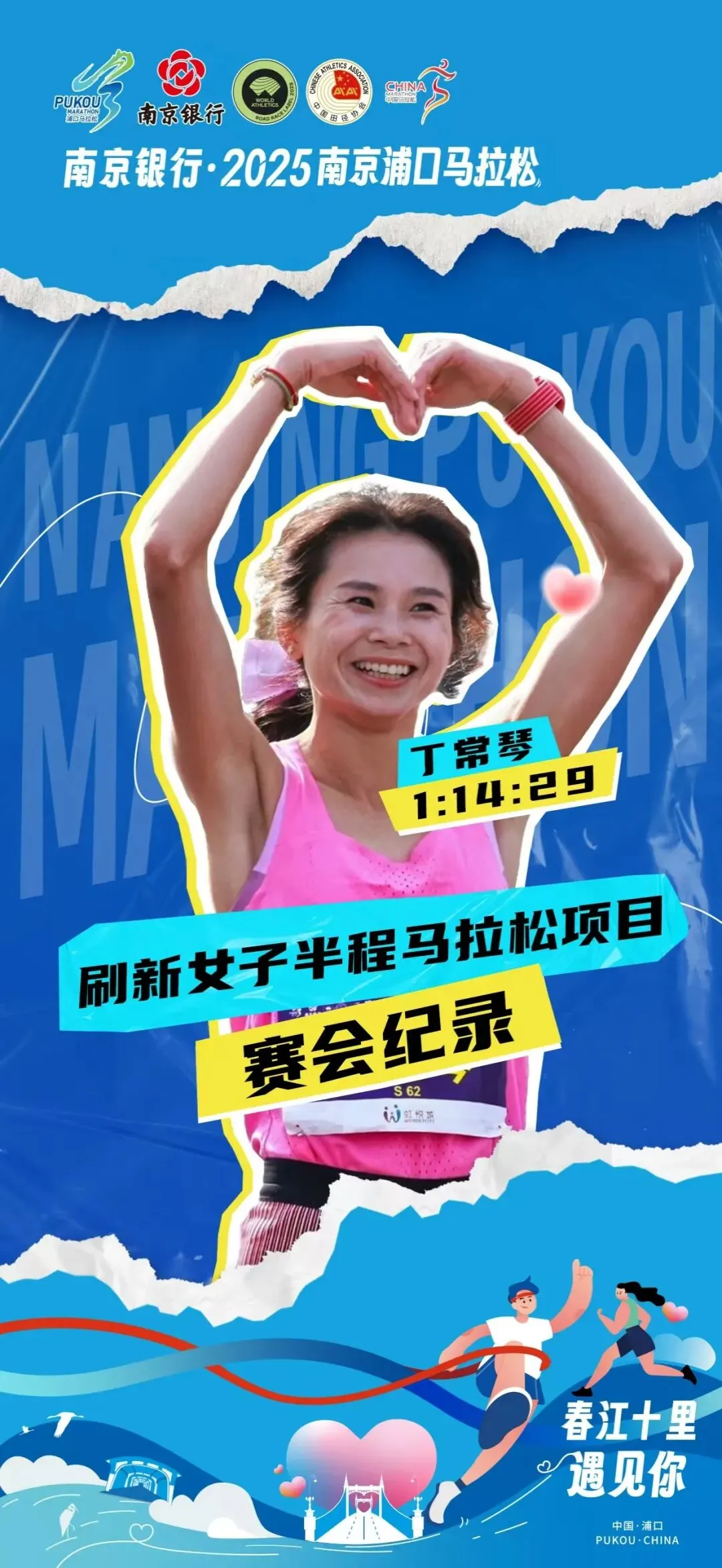 丁常琴以1:14:29碾过终点,把自己创造的浦口女子半程纪录1:15:05狠狠甩进历史尘埃。