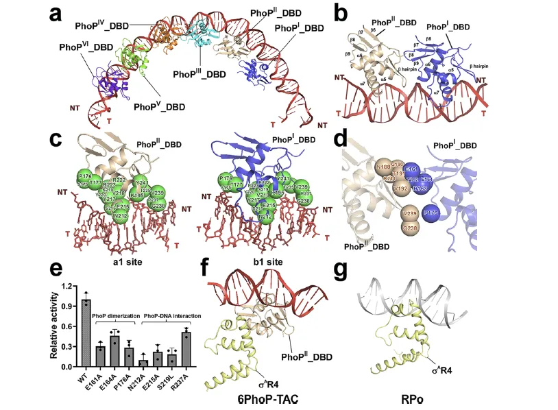 该图聚焦 6PhoP-TAC,详细解析了 PhoP 六聚体与启动子 DNA 的相互作用及关键残基的功能。结构显示,PhoP 的六个 DBD 结构域(PhoPI-DBD 至 PhoPVI-DBD)有序结合在上游双链 DNA 上,其中 PhoPI-DBD 与 PhoPII-DBD 形成头尾二聚体,通过 α7 螺旋插入 DNA 大沟识别碱基,C 端 β 发夹延伸至小沟,α5 螺旋与 DNA 骨架相互作用,且二聚体通过极性和疏水作用稳定。此外,PhoP 结合会占据 - 35 元件区域,干扰 σAR4 与 - 35 元件的经典相互作用。功能验证表明,PhoP 中参与 DNA 结合和二聚化的关键残基(如 E161A、S219L 等)突变后,体外转录活性显著降低,证实这些残基对 PhoP 的调控功能至关重要,同时也解释了减毒菌株中 PhoP S219L 突变导致毒力下降的分子机制。