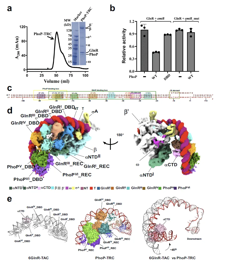 复合物结构特征:成功获得 RPo(3.63 Å)、2PhoP-TAC(3.46 Å)、4PhoP-TAC(3.70 Å)、6PhoP-TAC(3.31 Å)及 PhoP-TRC(3.68 Å)的冷冻电镜结构,明确各复合物中 PhoP、RNAP、GlnR 与 DNA 的结合模式。