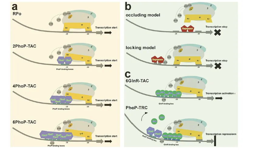 转录激活机制:PhoP 以串联二聚体形式协同结合启动子 PHO 盒,下游二聚体插入 - 35 元件区域的 DNA 大沟,取代 σAR4 与 - 35 元件的经典相互作用;同时 PhoP 通过 DBD 结构域与 RNAP 的 β flap、σAR4 及 αCTD 形成蛋白 - 蛋白相互作用,稳定 TAC 结构,6PhoP-TAC 中 αCTD 的参与进一步增强复合物稳定性,呈现 σ 适应型激活模式。