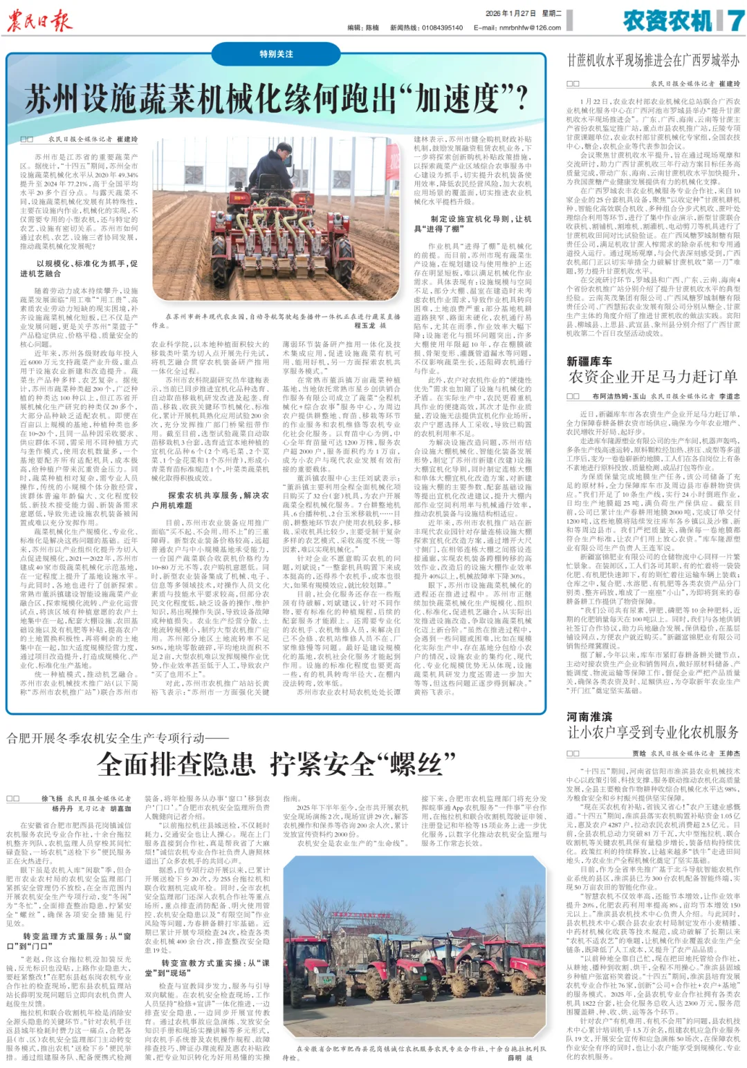苏州市农业农村局农机处处长谭建林表示,苏州市健全购机财政补贴机制,鼓励发展融资租赁农机业务,下一步将探索创新购机补贴政策措施,以探索蔬菜产业区域综合农事服务中心建设为抓手,切实提升农机装备使用效率,降低农民经营风险,加大农机应用场景的覆盖面,切实推进农业机械化水平提档升级。