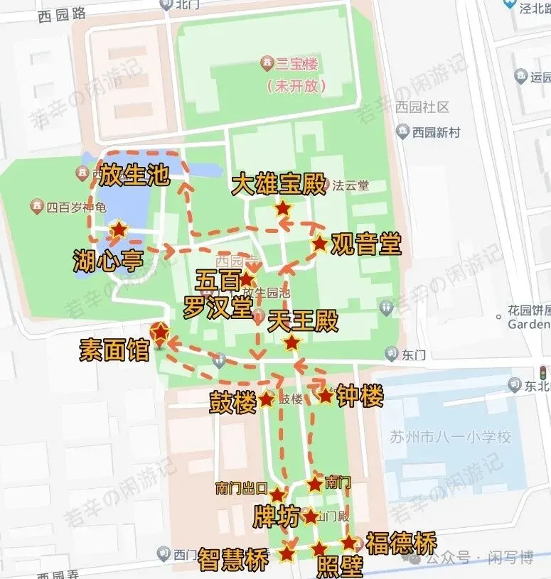 福德桥进-牌坊-南门(可领三支香)-钟楼(旁边引火处)-天王殿(殿前点香拜拜,香插回引火处旁边)-观音殿-大雄宝殿-西园放生池(看猫咪鸽子和乌龟)-五百罗汉堂-素面馆-鼓楼(可领对联福字和年历)-南门(河对岸照壁)-智慧桥出