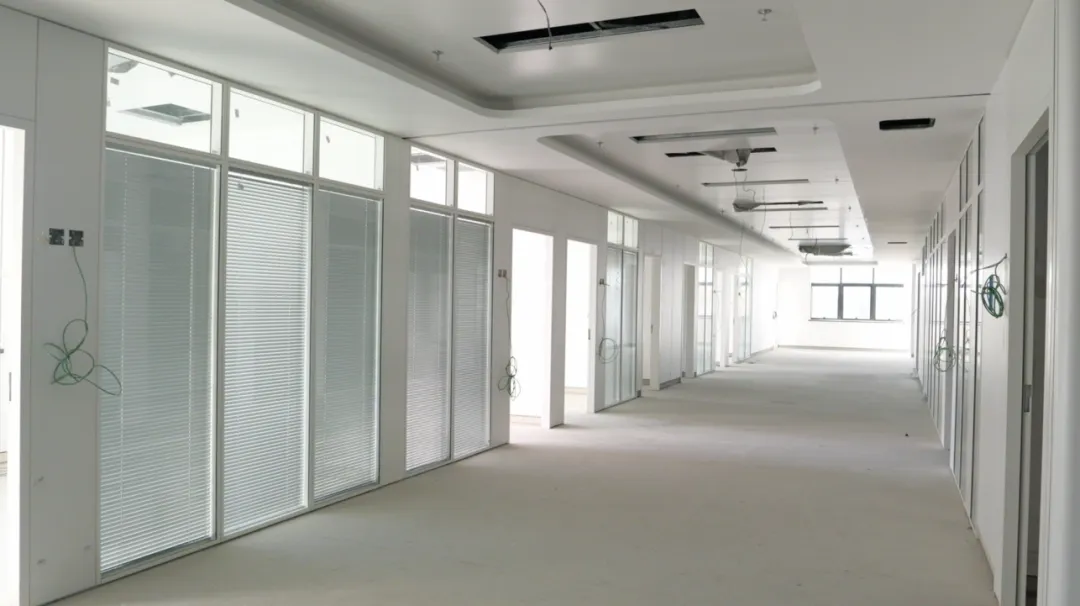 目前综合楼主体结构已全面封顶,正在进行内部装饰与设备安装。
