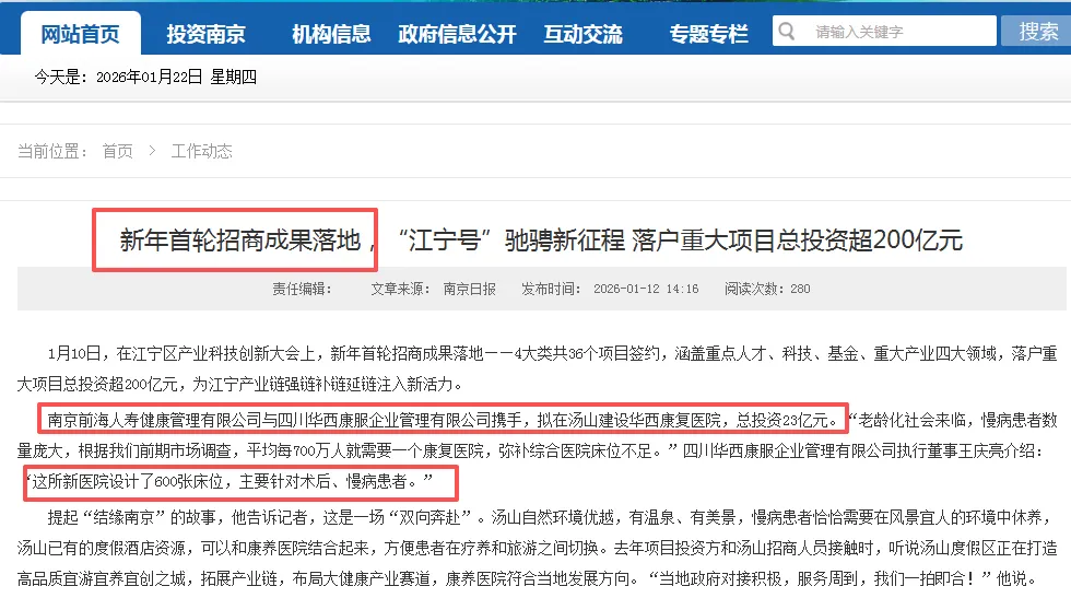 1月10日,江宁区产业科技创新大会公布消息:总投资23亿元的华西康复医院项目将落地汤山。