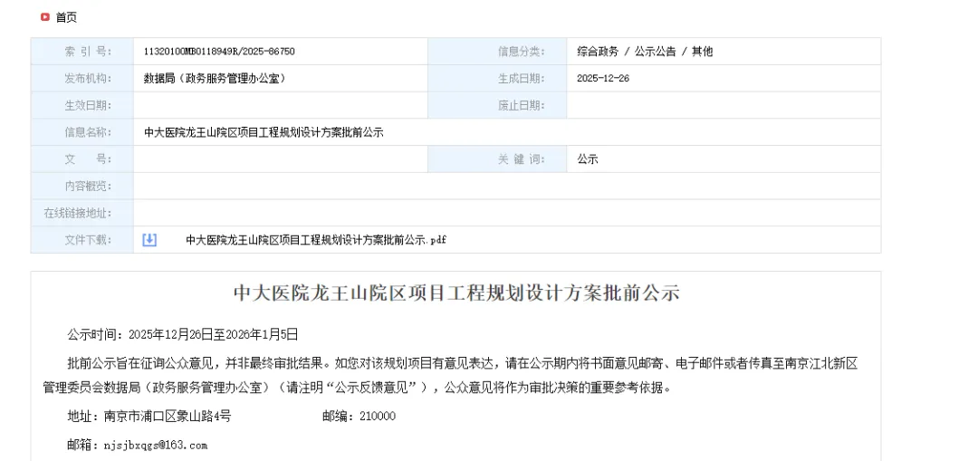 2025年12月,中大医院龙王山院区项目工程重新公示。规划显示,项目用地面积约11.3万平方米,拟建总建筑面积约28.3万平方米,主要功能为医疗用房、行政办公用房等。