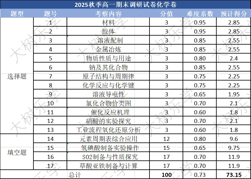 首先来看看这份《2025学年高一上学期期末统考化学卷》的考点分布和难度分布。
