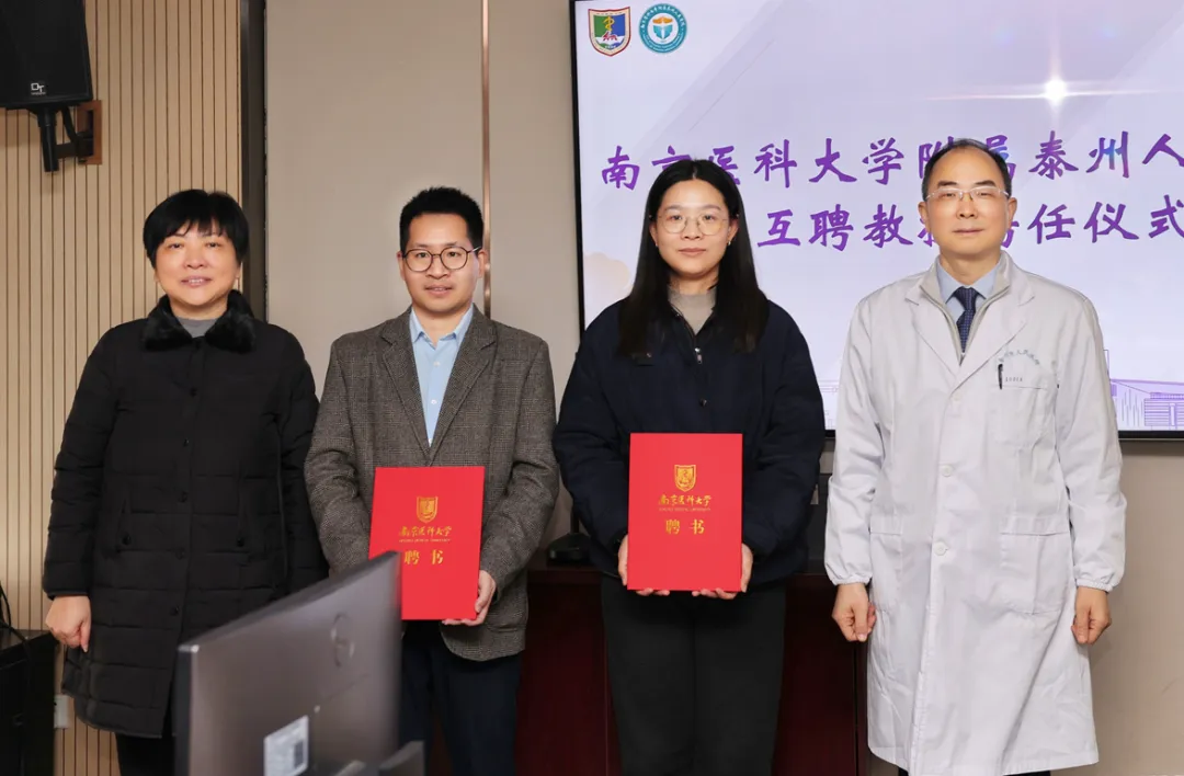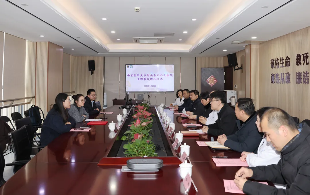 2026年1月28日下午,南京医科大学附属泰州人民医院互聘教授聘任仪式在总院行政楼九楼会议室隆重举行。南京医科大学人事处师资师德科孟凡力科长、药学院张涛教授、公共卫生学院储海燕教授,附属泰州人民医院党委书记顾宏伟,院长陈明龙,党委副书记、副院长李海俊及相关职能科室、临床科室负责人共同出席。