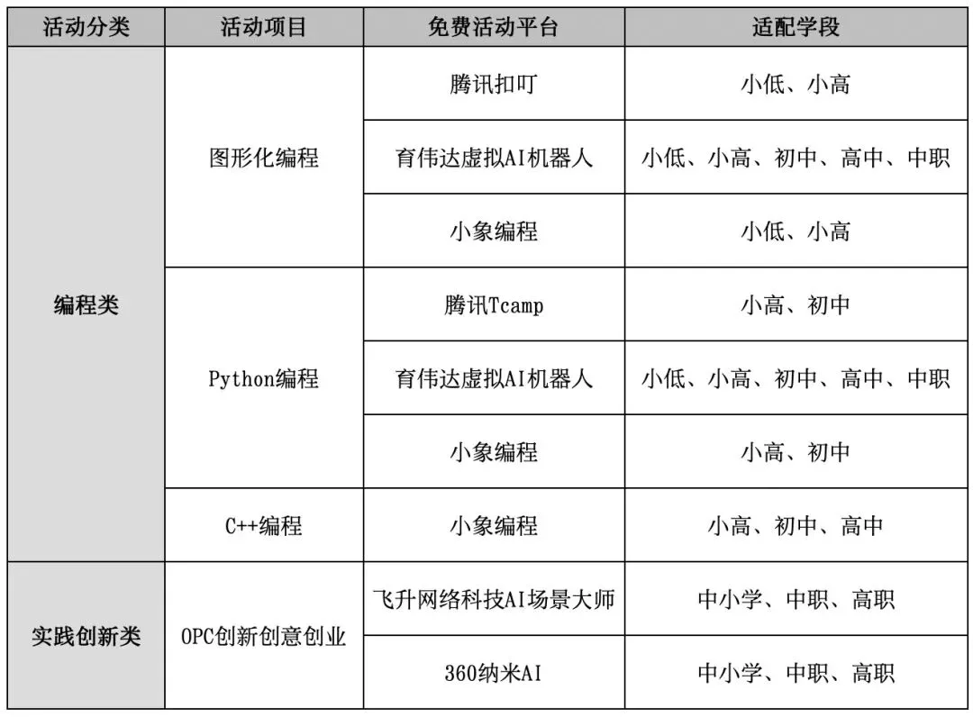 活动项目设置编程类和实践创新类两大类别,按小学低年级组、小学高年级组、初中组、高中组、中职组、高职组6个组别进行。