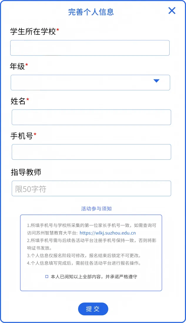 中小学生填报信息包含手机号和姓名(手机号与学校所采集的第一位家长手机号一致,如需查询可访问苏州智慧教育大平台https://wlkj.suzhou.edu.cn)。