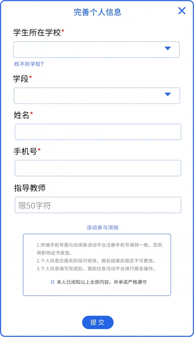 所有活动参与者登录活动专题页面后,需点击“完善个人信息”按钮,自主完成信息填报:
