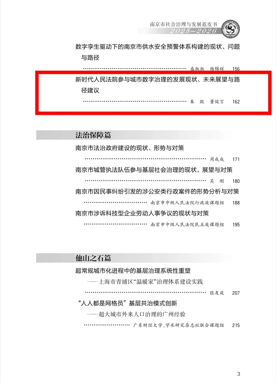 近日,南京市社会科学院发布《南京市经济社会发展系列蓝皮书2025—2026》。包含1本综合类的《南京市经济社会发展蓝皮书》和3本专题类的《南京市创新发展蓝皮书》《南京市文化发展蓝皮书》《南京市社会治理与发展蓝皮书》。雨花台区法院一篇调研成果——《新时代人民法院参与城市数字治理的发展现状、未来展望与路径建议》(作者:朱殷 董俊言)入选《南京市社会治理与发展蓝皮书》。