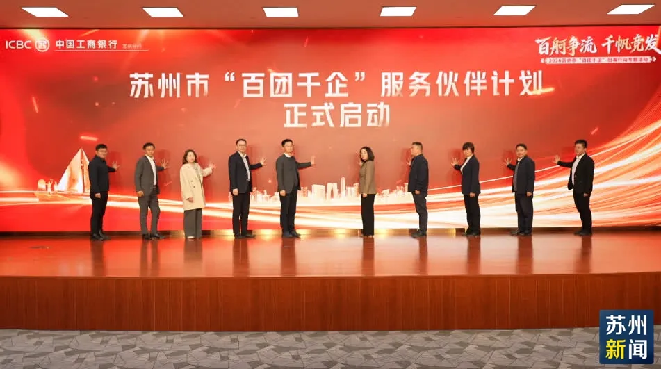 活动现场举行了2026年苏州“百团千企”出征仪式。据了解,今年市商务局、市工商联等多家部门将联合开展政府护航、服务伙伴、贸易促进三大计划,推动服贸数贸、双向经贸、贸易投资“三域联动”,全面助力企业开拓国际市场。本次活动还邀请了相关专家、机构代表围绕全球经贸形势与新兴市场机遇、工业制造业全球化布局趋势、企业海外拓展实践与规划以及跨境金融服务等开展了交流分享。