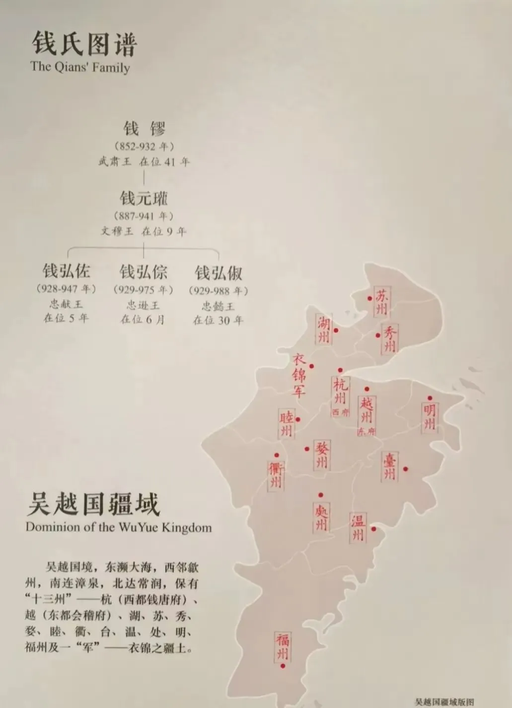 先来说说吴越国。吴越国( 907~978 ),为五代十国的十国之一。从开国君主钱镠(liú)起,共三世五王, 72 年国祚。吴越国开国君主钱镠,从唐末起就向唐称臣,唐灭后又向后梁投诚获得册封,正式建立吴越国。吴越国先后臣属于后梁、后唐、后晋、后汉、后周等中原王朝。到最后,审时度势的以“纳土归宋”告终。这就是吴越国钱氏的“乱世生存”法则,也是他们一族“传承发展”的智慧。“千年名门望族,两浙第一世家”,说的就是临安钱氏。