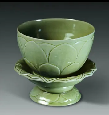这件莲花碗由碗和盏托两部分组成。碗为直口深腹圈足,盏托形状如豆,盘口外翻,束腰,圈足外撇。碗身外壁、盏托盘面和圈足均饰重瓣莲花,如浅浮雕状凸起, 构思巧妙,好似一朵盛开的莲花。从露胎处可见瓷胎呈灰白色,细腻致密,颗粒均匀纯净。特别是它的釉色滋润内敛,呈现出玉一般的温润感。 判断越窑青瓷为秘色瓷,要满足三个条件:由官窑烧制;成瓷质量高,形美釉佳;吴越王室自用或用于供奉,“臣庶不得用之”。珍贵的秘色瓷是越窑青瓷无可非议的上乘品。浙江自古以来便是制瓷、产瓷之地。虽然,有着瓷土优势和技术优势,但想要烧制理想的秘色瓷也并不容易。生产环节中,秘色瓷需要在微生烧条件下烧制,当时的制瓷工人们使用依坡而建、容易升温的龙窑来对瓷器进行烧制。但龙窑的内部气温状况是十分复杂的,即使最有技术和经验的制瓷工,失败率也非常高。