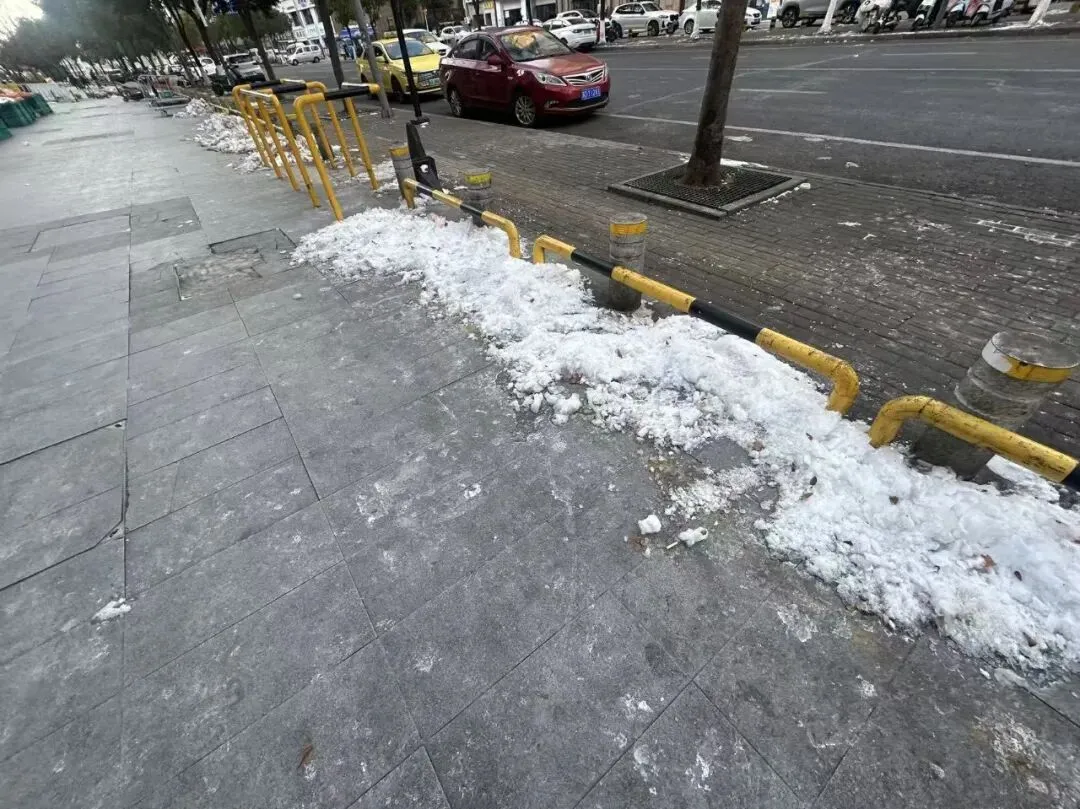 前天的雪已经停了,今天的风里还带着雪后的清寒。人行道旁,被铲到护栏边的雪堆还没有完全融化,白得发脆,边缘浸在湿漉漉的地砖上,洇出一圈浅浅的水渍。
