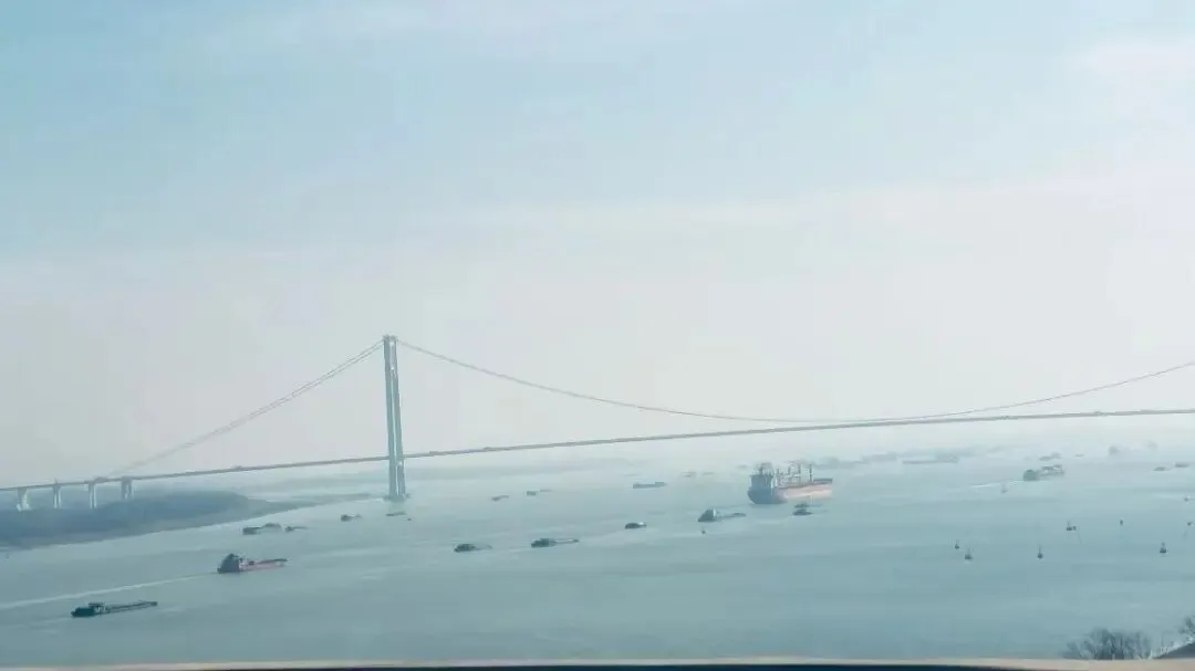 宽阔的江面上,一艘艘货船拖着细碎的波纹缓缓前行,像散落在水面的墨点,把宽阔的江面衬得愈发辽远。远处的悬索大桥横亘两岸,银灰色的桥身在薄雾里舒展着线条,钢索斜斜拉起,仿佛是天地间一道利落的笔触。