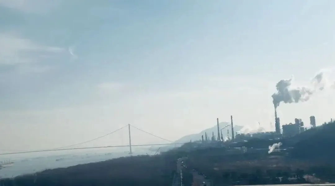 转过视线,江对岸的山坡上,几座烟囱正吞吐着白色的烟气,在淡蓝色的天空里洇开柔软的云絮。厂房的轮廓在枯褐的树林间起伏,与远处的山峦连成一片,带着工业时代的硬朗气息。