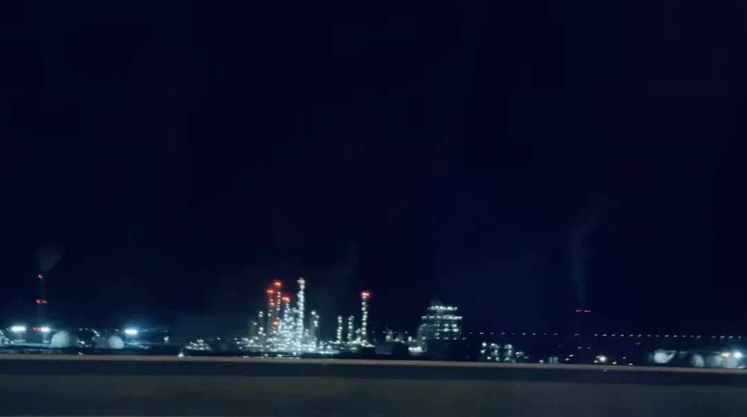 转过弯,江对岸的厂区灯火便撞进视野。高低错落的塔林亮着密集的银白灯光,像一片落在夜里的星群,几处红色警示灯在塔顶明灭,添了几分硬朗的烟火气。白日里清晰的烟囱与厂房,此刻都融在浓稠的夜色里,只剩这片灯火在黑暗里兀自明亮。