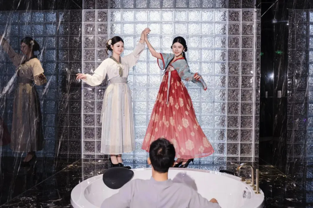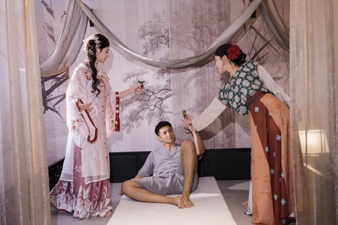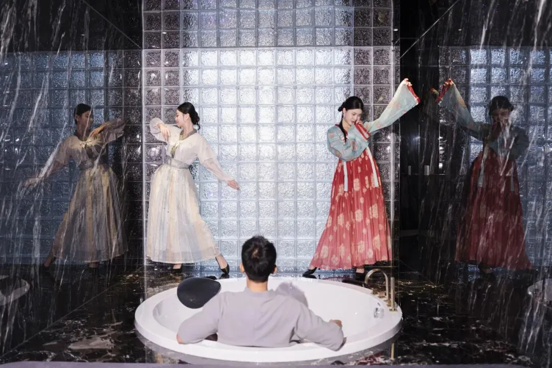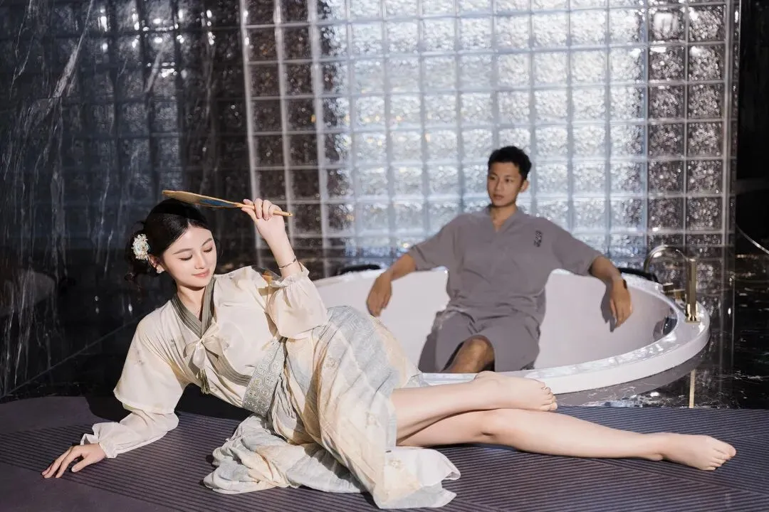 这里没有喧闹的公共区域,仅设独立私享包间,每间配备专属卫浴、恒温蒸汽房与静谧休憩区,推门即隔绝都市浮躁。白墙黛瓦与原木格栅勾勒东方意境,手工实木陈设、名家墨宝点缀其间,搭配定制香氛与流水声,营造沉浸式静谧氛围。
