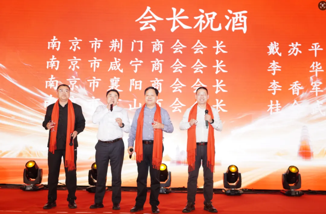 紧接着,晚会迎来了温馨而激昂的祝酒环节。南京市荆门商会会长戴苏平、咸宁商会会长李华、襄阳商会会长李向军、京山商会会长桂会武联袂登台,共举杯盏。“祝福我们伟大的祖国繁荣昌盛、国泰民安!”这是全体楚商根植于心的家国情怀。四位会长的祝福从国到家,从故乡到南京,再到每一位奋斗者,将晚宴的气氛再次推向高潮。