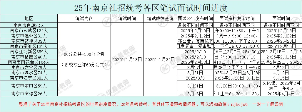最近不少同学老师在疑问,南京教师社招统考笔试结束后,什么时间出成绩,什么时间进行面试,给大家整理了关于25年社招统考各区的面试时间进度情况,可以参考:
