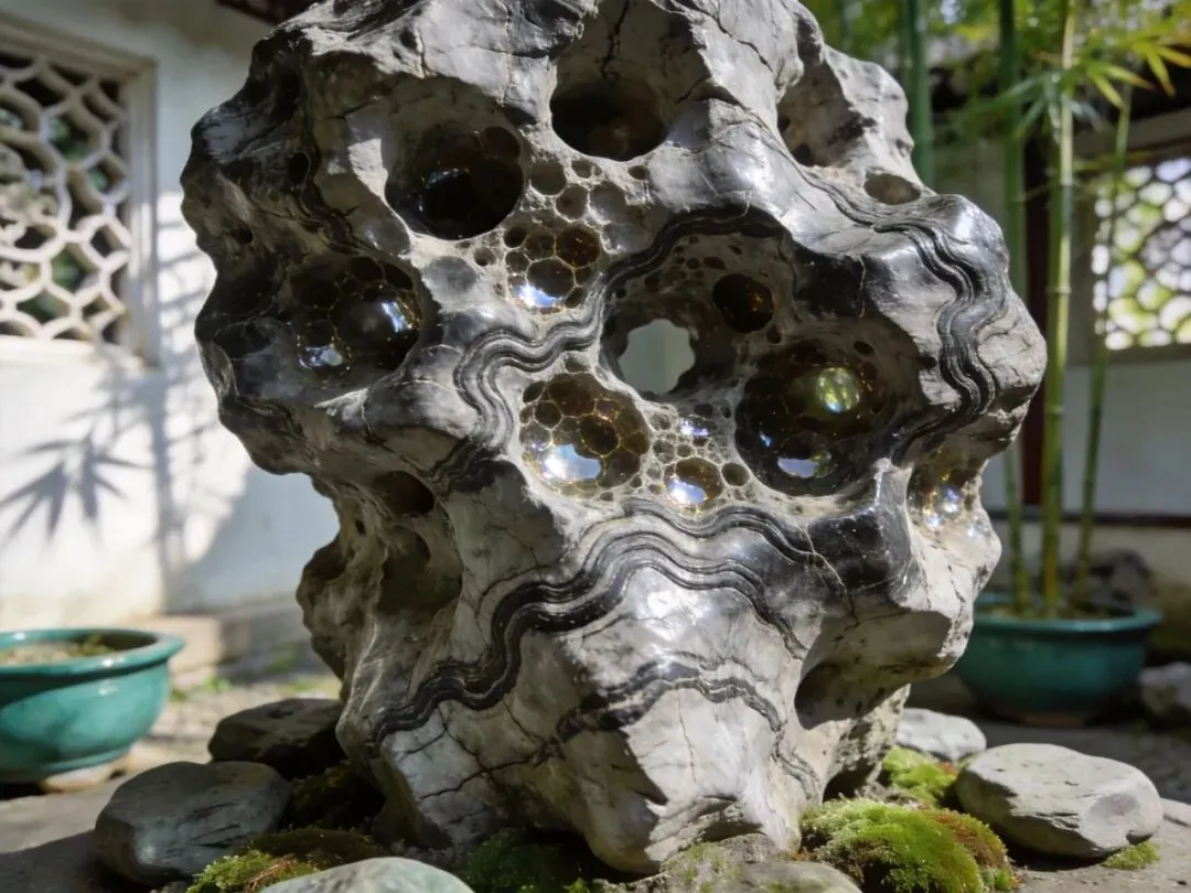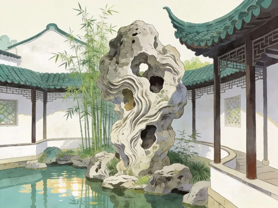 咱先说说《选石》里的"顶流石头"——太湖石!这太湖石可是苏州园林里的"C位担当",相当于现在娱乐圈的"流量小花",走到哪都是焦点!计成在书里说太湖石"性坚而润,有嵌空、穿眼、婉转、险怪势",翻译成人话就是:这石头硬邦邦的,还透着点光泽,身上全是洞洞眼眼,形状奇奇怪怪的,就像被老天爷用刀刻过一样!