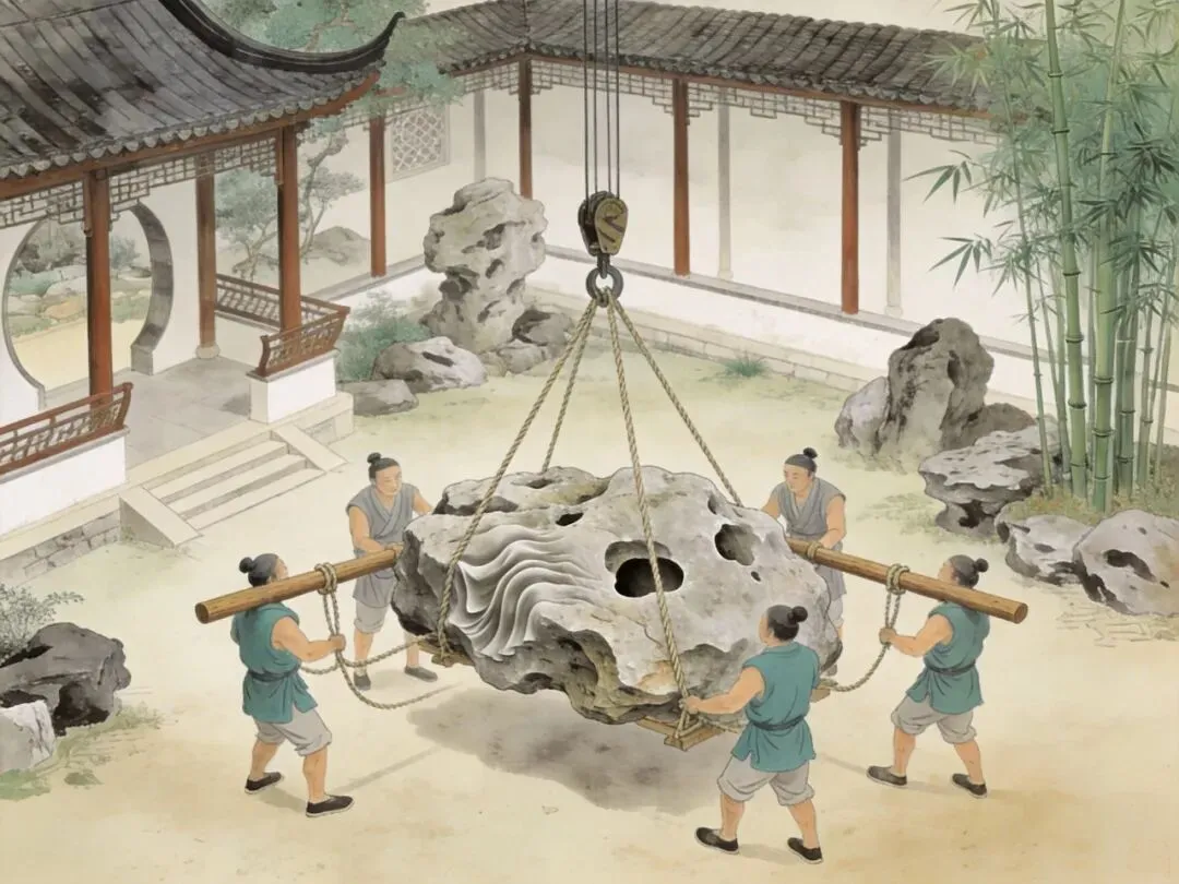 古代工匠用传统工具搬运太湖石的场景图