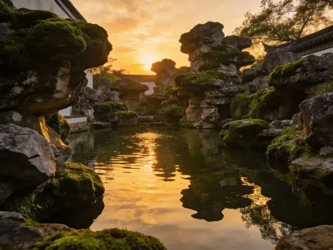 夕阳下的苏州园林假山与水景