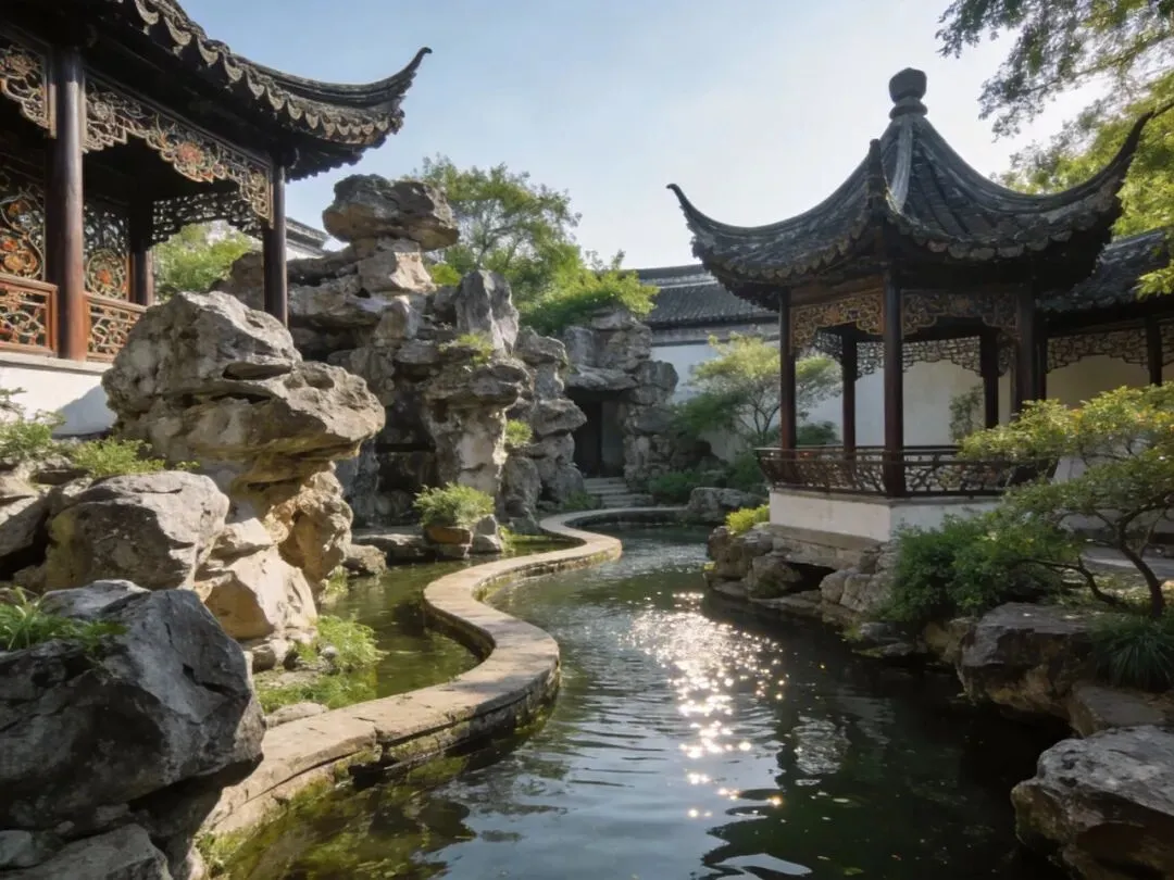苏州园林全景,展示假山、亭台、水景的和谐搭配