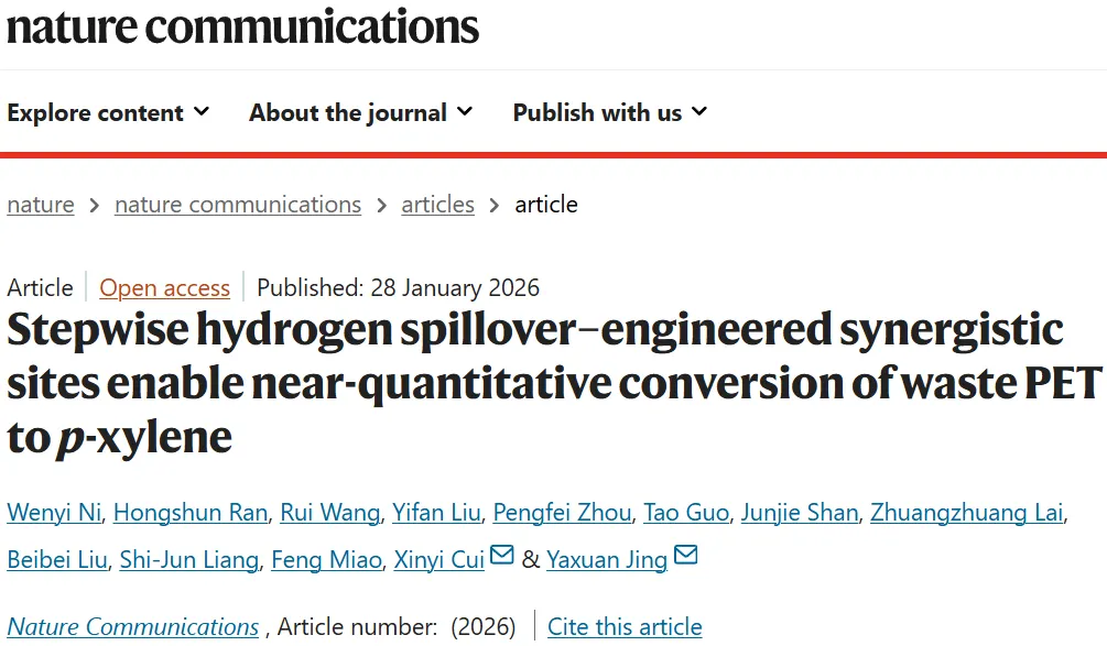 2026年1月28日,南京大学崔昕毅,景亚轩在国际知名期刊Nature Communications发表题为《Stepwise hydrogen spillover–engineered synergistic sites enable near-quantitative conversion of waste PET to p-xylene》的研究论文,Wenyi Ni,Hongshun Ran为论文共同第一作者,崔昕毅,景亚轩为论文共同通讯作者。