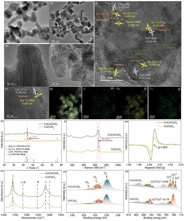 图3:催化剂微结构表征。TEM显示Cu引入使粒径减小并诱发hcp-Co→fcc-Co部分相变;HR-TEM捕获Co0/CoOx三类界面;XRD、Raman、EPR、吡啶-IR、XPS共同证实Cu诱导晶格畸变→氧空位浓度↑→Lewis酸位点↑。