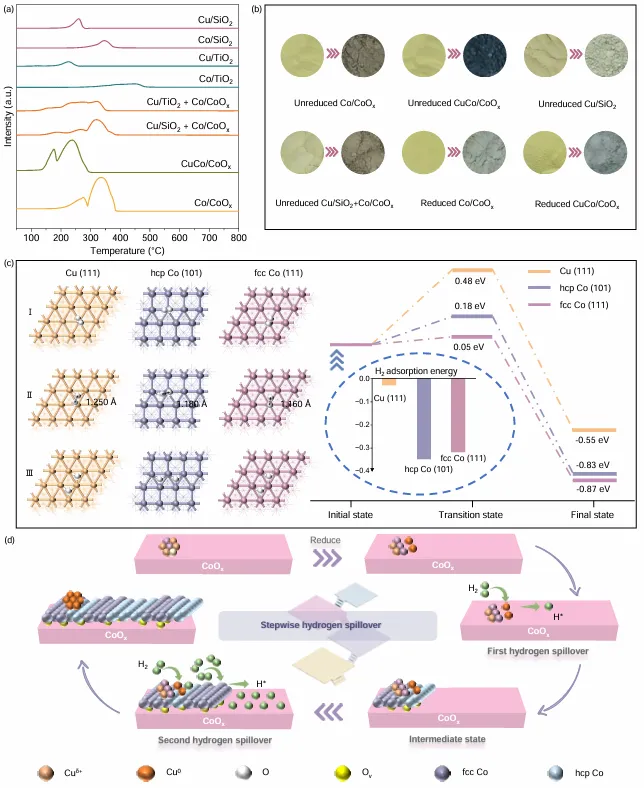 图4:逐级氢溢流机制。H2-TPR峰整体下移~100 ℃;WO3显色实验证实Cu先还原并启动初级溢流,新生fcc-Co0作为二级溢流中心;DFT计算fcc-Co(111)解离H2能垒仅0.05 eV,远低于hcp-Co与Cu,阐明相变促进二次溢流。
