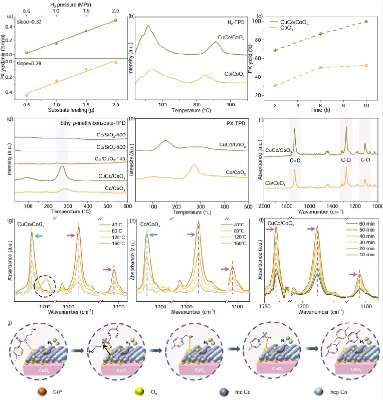 图5:构-效关系与分子机理。a)H2压与底物浓度协同影响PX产率;b)H2-TPD显示CuCo/CoOx吸附量↑且溢流H*脱附温度↑;c)时间曲线证明Co/CoOx受产物抑制;d-e)底物与PX的TPD揭示CuCo/CoOx吸附底物强、产物弱,避免自毒;f-i)原位FTIR捕获C–O键优先活化并生成醛中间体;j)提出“C–O活化→溢流H*进攻→脱羟→PX脱附”完整循环。