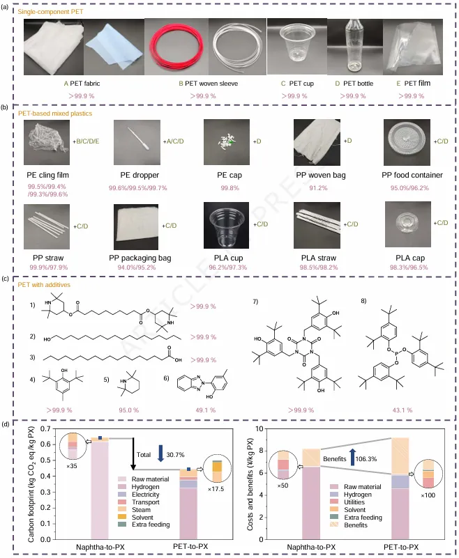 图6:真实废塑料转化与经济技术评估。a-b)28种实际PET(纯料、含添加剂、混合塑料)均>99%PX收率;c)八种典型添加剂仅两种致轻度失活;d)生命周期评估:PET-to-PX路线成本¥5.90kg-1、利润提升106%,碳排放降30.7%,对化石路线形成经济与环保双重优势。