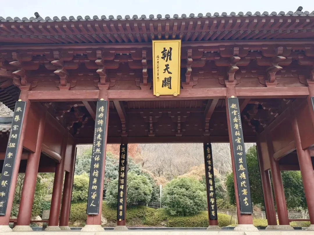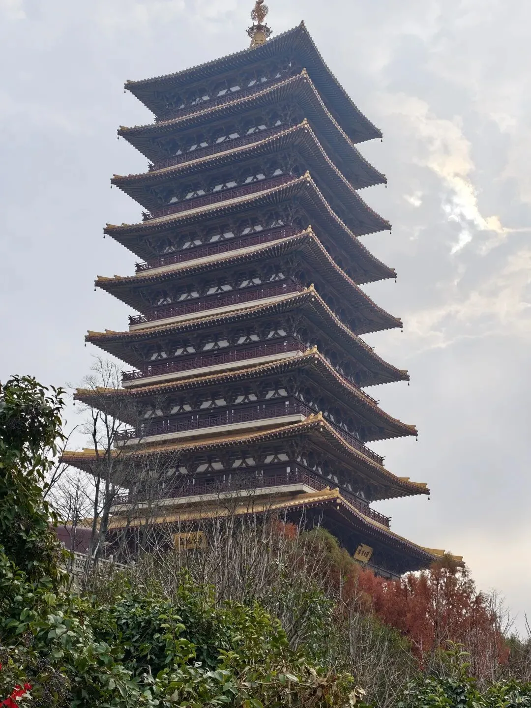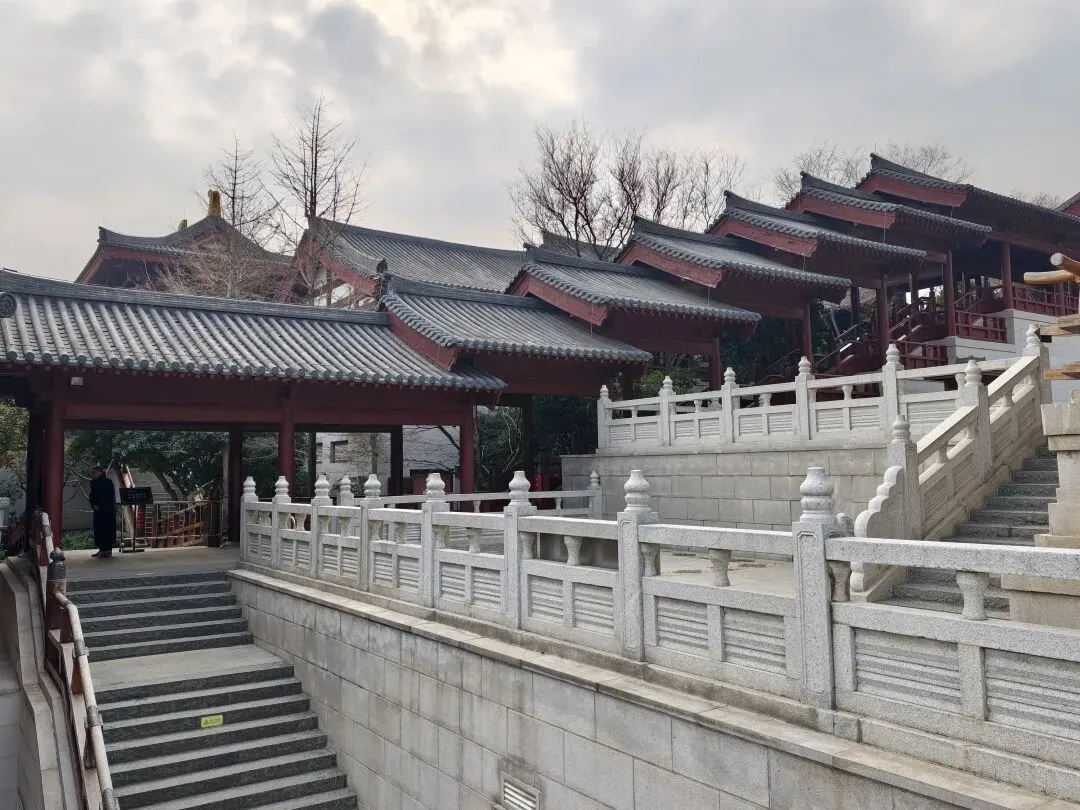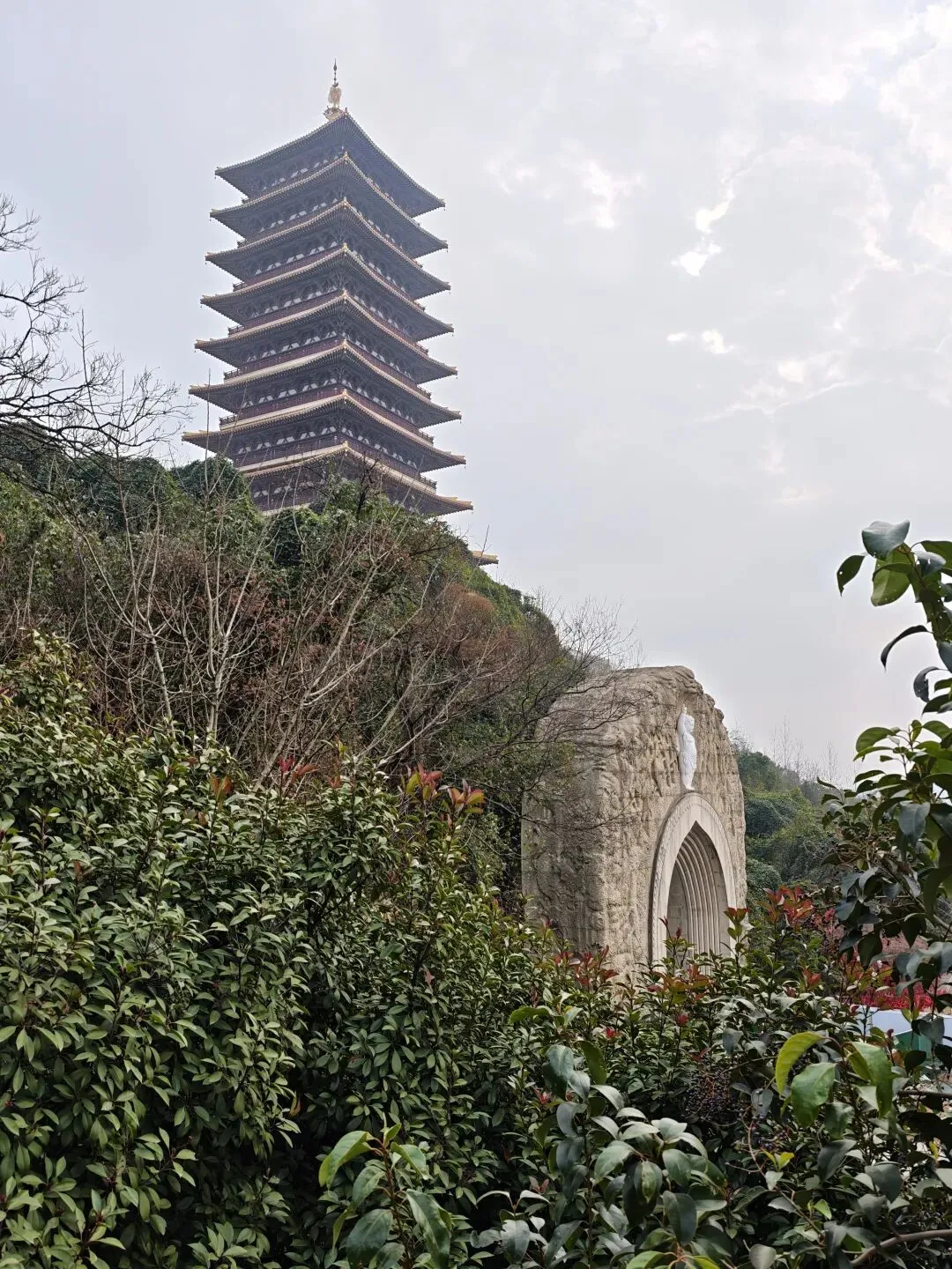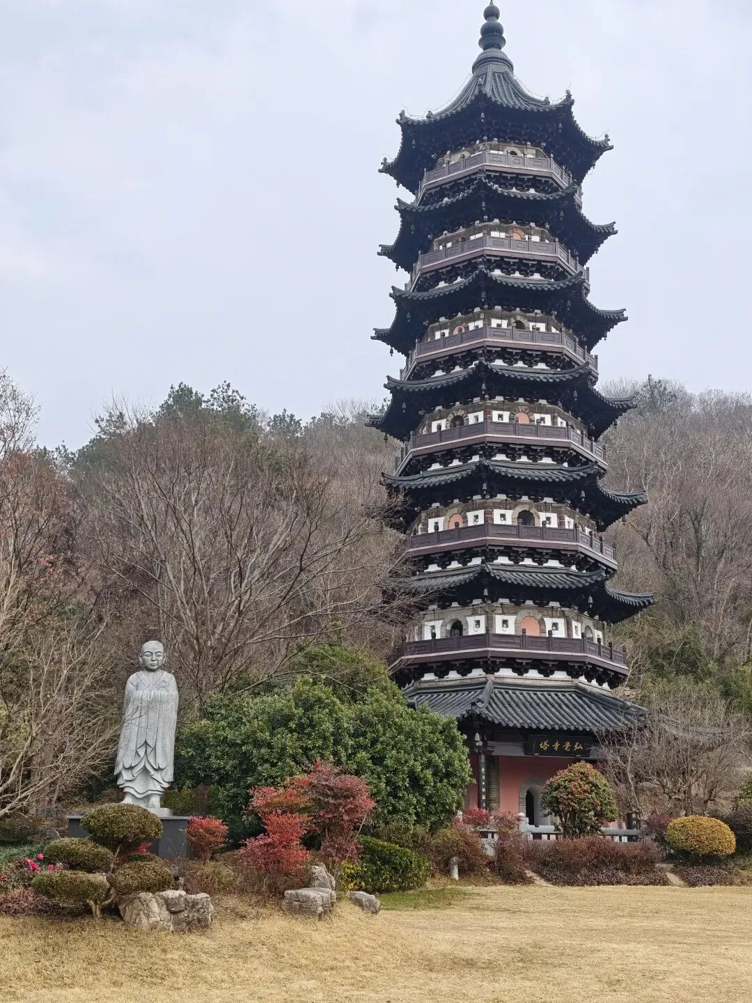 殿内中心是一座高达21.8米的舍利大塔,塔中安奉着佛顶骨舍利(通常仅在特定佛教节日公开瞻礼)。顶部中心的天眼更是透着淡蓝色神秘的光泽,四周的墙壁和穹顶布满精美的佛像、浮雕和壁画,宛如进入了极乐世界。佛顶骨舍利是全世界目前唯一发现的释迦牟尼佛顶骨真身舍利,是佛教无上圣物。佛顶宫因此成为了世界级的佛教圣地之一,具有了极其崇高的宗教地位和文化价值。反复在千佛殿走过,殿内空间并未很大,360度空间中的每一寸都是艺术的精华,沿顺时针方向一一拜过。整个空间充斥着金色、红色、蓝色、绿色等饱和度极高的色彩,晕染的整个空间富丽堂皇,恍若在极乐世界中。环绕着千佛殿有一条长长的回廊,称为万佛廊,同样装饰着数以万计的佛龛与造像,艺术价值也极高。在这里从廊柱,到地砖,从灯光,到墙面,几乎是所有空间,都是各种佛教艺术形式的展示。虽无法一一说清材质、制作工艺,一一走过看过,也是一次一次的被东方美学深深的折服着。一切都美轮美奂,这还能用什么词汇来表达呢,也只能是贪婪的单向吸收着。透过每一尊佛像,它的神韵或给人以慈悲、或给人以智慧、或给人以宁静、或给人以崇高。受此洗礼,心情也变的安静平和。在万佛廊俯瞰千佛殿,站在高处,又看到了不同角度更多的美好,也是将在底层时需仰望看到的景物,用平视来体验,看的也更真切些,众佛陀多维度普度众生。万佛廊很长,这也更有幸在艺术的长廊中能多领略些其中的千变万化。出佛顶宫,看到有上山路可供上山游览,附近也有商业街供应餐食,餐食都是素食,味道也一般。接下来就是登临和佛顶宫相邻的佛顶塔,塔高共九级,可攀爬最高七级。登高望远在此可眺望佛顶宫全貌、牛头禅院、弘觉寺塔及牛首山的自然山水和临近城市市貌。佛顶塔每一层都有不同材质,不同佛教故事的壁画、浮雕,在第六层供奉有一口大钟。佛顶塔为现代仿唐代楼阁式塔,高约88米,九级四面,斗拱宏大,出檐深远。与佛顶塔相临为牛头禅院,牛头禅院内,房舍典雅,植被茂密,最显著站C位的建筑当属弘觉寺塔,这是一座唐代古塔复修于明代。现代仿古的佛顶塔和历史久远的弘觉寺塔彼此相望,可谓是新塔古塔交相辉映。登小山头进入牛头禅院,院落不大,一进院,弘觉寺塔赫然在立,这座塔也是牛首山现存最古老、最珍贵的文物建筑,是真正的千年古塔。原为牛首山弘觉寺的附属建筑。弘觉寺正是唐代牛头禅宗祖庭的核心寺院,法融禅师曾在此弘法。因此,这座塔直接关联着牛首山最辉煌的佛教时期——牛头宗祖庭时代。穿过长廊,就可立于弘觉寺塔前。塔前没有路,只有一些植物相随。剥开植物枝条,站于塔正面,静静仰视古塔,和这座千年古塔默然相对,感受着它的古朴、原真、沧桑。和古塔走过的岁月来一段内心的对话。弘觉寺塔是一座七级八面的砖木结构楼阁式塔,是典型的明代塔建筑风格。现塔身保存基本完好,但塔内的木结构楼梯、腰檐等已在岁月中损毁,因此目前不能登临。完全以“素颜”状态展示着。南京的早梅也已迫不及待的露出红颜,还想着能看看南京梅花山的梅花盛景,因时间限制不可得,没想到在牛首山竟然也圆了一点心愿,看到了刚刚绽放的早梅。出牛头禅院找到徒步山路,决定徒步下山,冬日的牛首山,山中的植物大都也还保留有绿色,这也是和北方的山体大不同处,南京和济南虽只是3个小时的车程差距,但植物绿色的覆盖程度要大的多。早开的梅花虽还未成规模,偶尔的一树红色则更是山体的点缀,好看。路经“朝天阙”牌坊,这个牌坊名提示着这是一条朝拜之路,这个牌坊也徒步路线的一个重要景观。途经“明代摩崖石刻”。石刻位于牛首山东峰兜率岩前,三面岩壁上共凿有133尊石像,据考证为明代开凿。这一片也就被称为明代摩崖石刻,这也是徒步路上的一处风景,也是牛首山佛教历史的见证。在徒步路中每隔一段,就有一位牛头宗师的塑像,通过他们的介绍也可更进一步了解牛首山佛教的渊源。接下来会走到岳飞抗金故垒,也是很感慨当年的北方民族已经这么深入中原了。故垒遗址位于牛首山东麓,现存部分土垒、壕沟遗迹,长约数公里。虽历经风雨侵蚀,但轮廓仍可辨识。