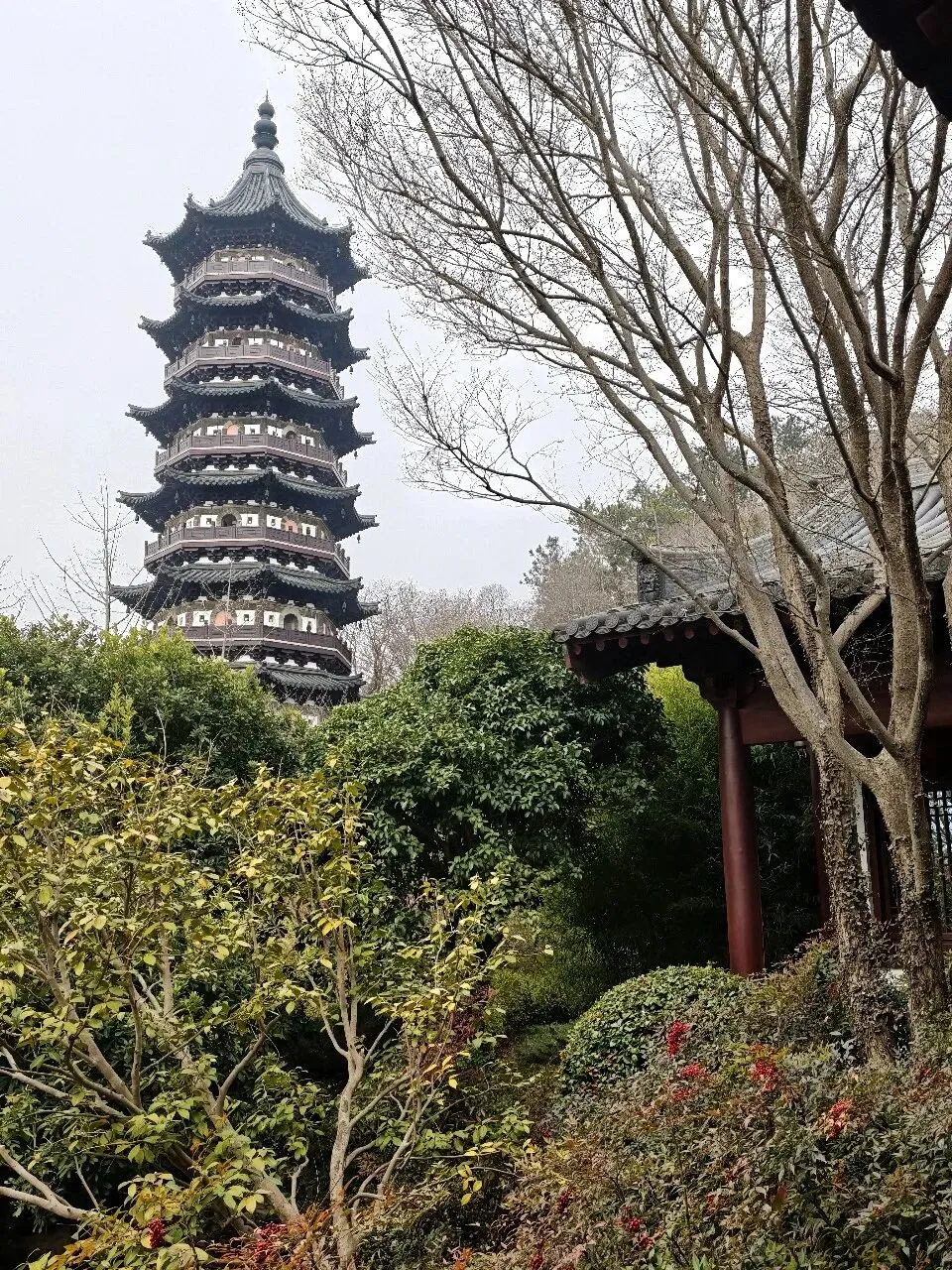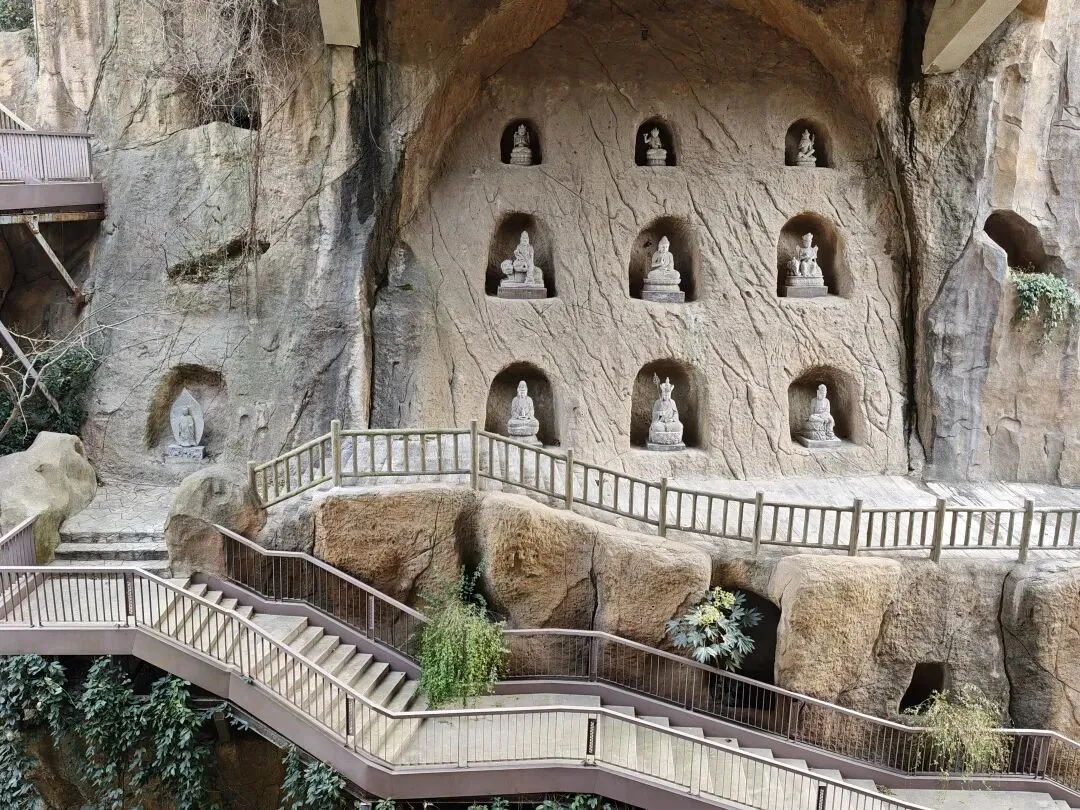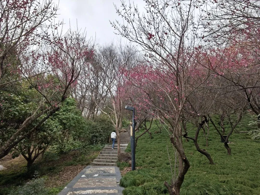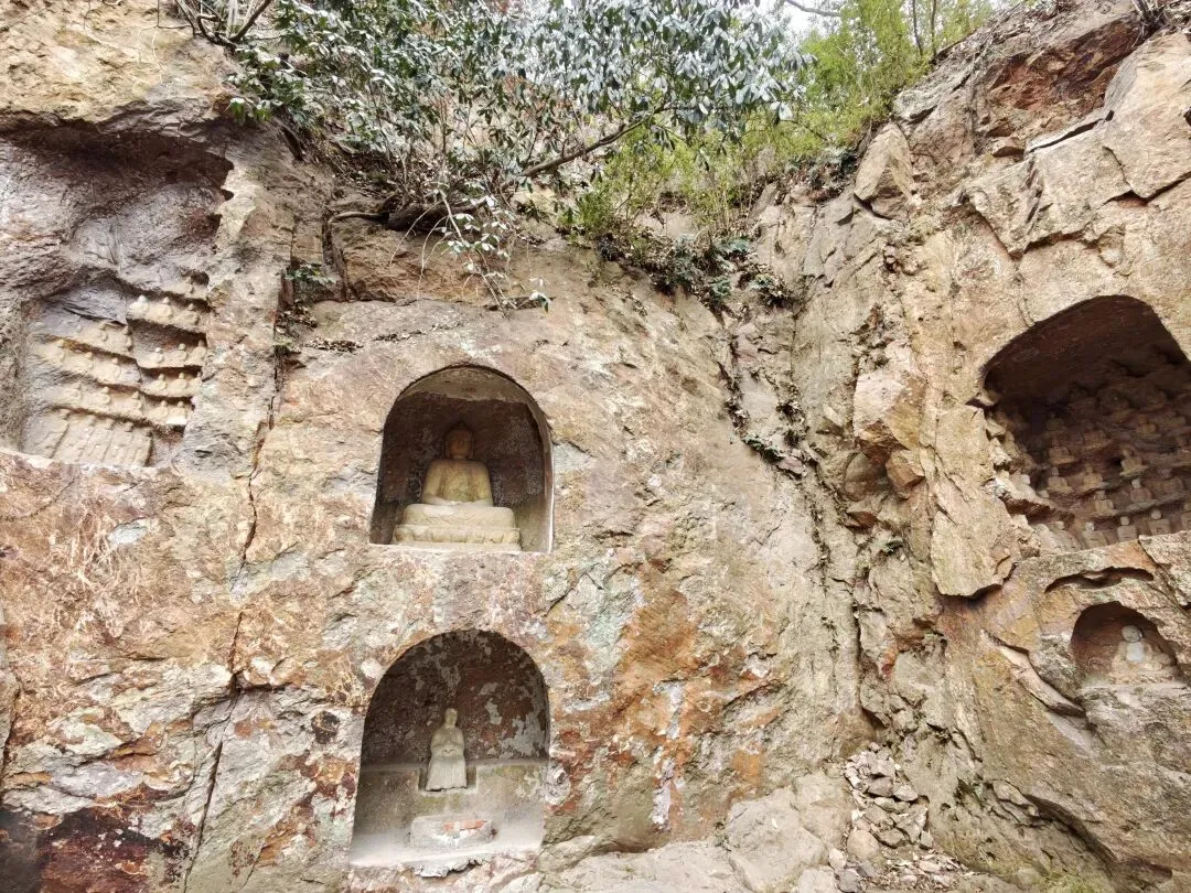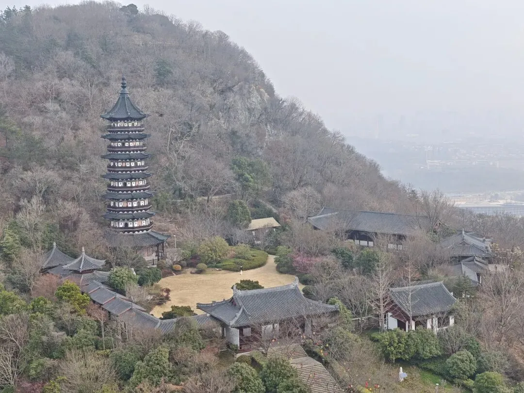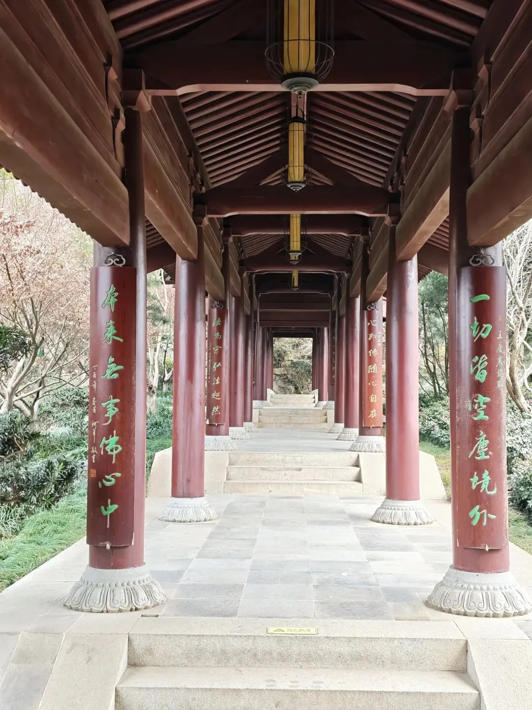 殿内中心是一座高达21.8米的舍利大塔,塔中安奉着佛顶骨舍利(通常仅在特定佛教节日公开瞻礼)。顶部中心的天眼更是透着淡蓝色神秘的光泽,四周的墙壁和穹顶布满精美的佛像、浮雕和壁画,宛如进入了极乐世界。佛顶骨舍利是全世界目前唯一发现的释迦牟尼佛顶骨真身舍利,是佛教无上圣物。佛顶宫因此成为了世界级的佛教圣地之一,具有了极其崇高的宗教地位和文化价值。反复在千佛殿走过,殿内空间并未很大,360度空间中的每一寸都是艺术的精华,沿顺时针方向一一拜过。整个空间充斥着金色、红色、蓝色、绿色等饱和度极高的色彩,晕染的整个空间富丽堂皇,恍若在极乐世界中。环绕着千佛殿有一条长长的回廊,称为万佛廊,同样装饰着数以万计的佛龛与造像,艺术价值也极高。在这里从廊柱,到地砖,从灯光,到墙面,几乎是所有空间,都是各种佛教艺术形式的展示。虽无法一一说清材质、制作工艺,一一走过看过,也是一次一次的被东方美学深深的折服着。一切都美轮美奂,这还能用什么词汇来表达呢,也只能是贪婪的单向吸收着。透过每一尊佛像,它的神韵或给人以慈悲、或给人以智慧、或给人以宁静、或给人以崇高。受此洗礼,心情也变的安静平和。在万佛廊俯瞰千佛殿,站在高处,又看到了不同角度更多的美好,也是将在底层时需仰望看到的景物,用平视来体验,看的也更真切些,众佛陀多维度普度众生。万佛廊很长,这也更有幸在艺术的长廊中能多领略些其中的千变万化。出佛顶宫,看到有上山路可供上山游览,附近也有商业街供应餐食,餐食都是素食,味道也一般。接下来就是登临和佛顶宫相邻的佛顶塔,塔高共九级,可攀爬最高七级。登高望远在此可眺望佛顶宫全貌、牛头禅院、弘觉寺塔及牛首山的自然山水和临近城市市貌。佛顶塔每一层都有不同材质,不同佛教故事的壁画、浮雕,在第六层供奉有一口大钟。佛顶塔为现代仿唐代楼阁式塔,高约88米,九级四面,斗拱宏大,出檐深远。与佛顶塔相临为牛头禅院,牛头禅院内,房舍典雅,植被茂密,最显著站C位的建筑当属弘觉寺塔,这是一座唐代古塔复修于明代。现代仿古的佛顶塔和历史久远的弘觉寺塔彼此相望,可谓是新塔古塔交相辉映。登小山头进入牛头禅院,院落不大,一进院,弘觉寺塔赫然在立,这座塔也是牛首山现存最古老、最珍贵的文物建筑,是真正的千年古塔。原为牛首山弘觉寺的附属建筑。弘觉寺正是唐代牛头禅宗祖庭的核心寺院,法融禅师曾在此弘法。因此,这座塔直接关联着牛首山最辉煌的佛教时期——牛头宗祖庭时代。穿过长廊,就可立于弘觉寺塔前。塔前没有路,只有一些植物相随。剥开植物枝条,站于塔正面,静静仰视古塔,和这座千年古塔默然相对,感受着它的古朴、原真、沧桑。和古塔走过的岁月来一段内心的对话。弘觉寺塔是一座七级八面的砖木结构楼阁式塔,是典型的明代塔建筑风格。现塔身保存基本完好,但塔内的木结构楼梯、腰檐等已在岁月中损毁,因此目前不能登临。完全以“素颜”状态展示着。南京的早梅也已迫不及待的露出红颜,还想着能看看南京梅花山的梅花盛景,因时间限制不可得,没想到在牛首山竟然也圆了一点心愿,看到了刚刚绽放的早梅。出牛头禅院找到徒步山路,决定徒步下山,冬日的牛首山,山中的植物大都也还保留有绿色,这也是和北方的山体大不同处,南京和济南虽只是3个小时的车程差距,但植物绿色的覆盖程度要大的多。早开的梅花虽还未成规模,偶尔的一树红色则更是山体的点缀,好看。路经“朝天阙”牌坊,这个牌坊名提示着这是一条朝拜之路,这个牌坊也徒步路线的一个重要景观。途经“明代摩崖石刻”。石刻位于牛首山东峰兜率岩前,三面岩壁上共凿有133尊石像,据考证为明代开凿。这一片也就被称为明代摩崖石刻,这也是徒步路上的一处风景,也是牛首山佛教历史的见证。在徒步路中每隔一段,就有一位牛头宗师的塑像,通过他们的介绍也可更进一步了解牛首山佛教的渊源。接下来会走到岳飞抗金故垒,也是很感慨当年的北方民族已经这么深入中原了。故垒遗址位于牛首山东麓,现存部分土垒、壕沟遗迹,长约数公里。虽历经风雨侵蚀,但轮廓仍可辨识。