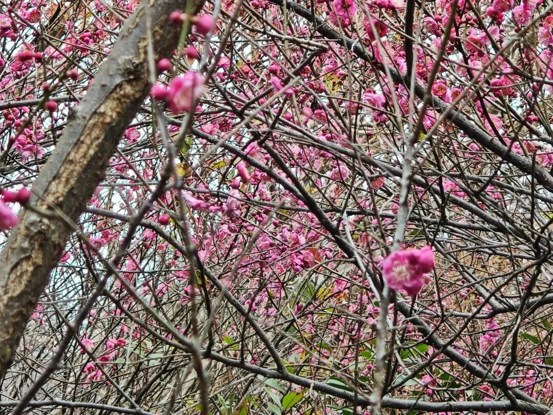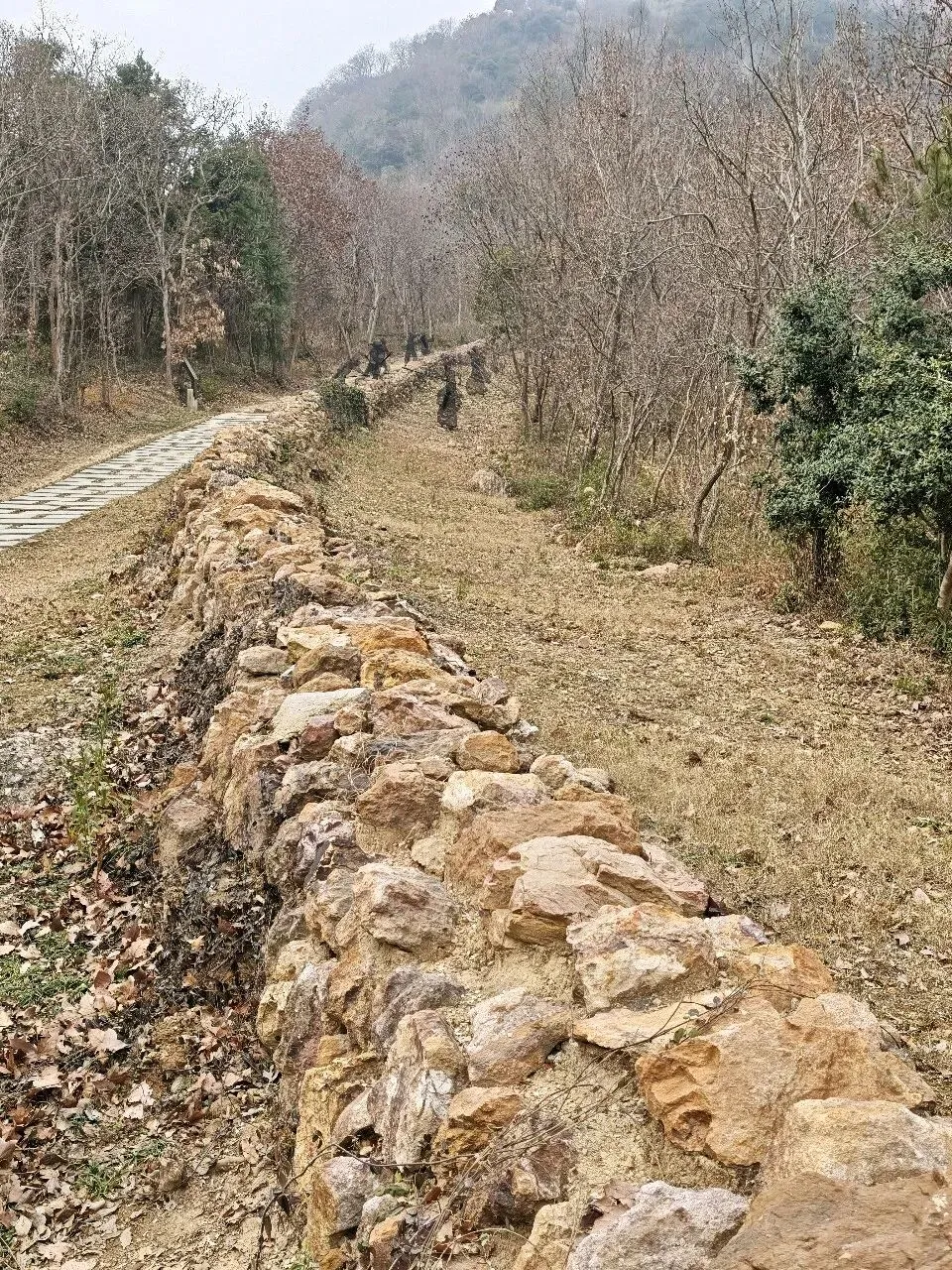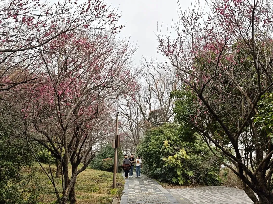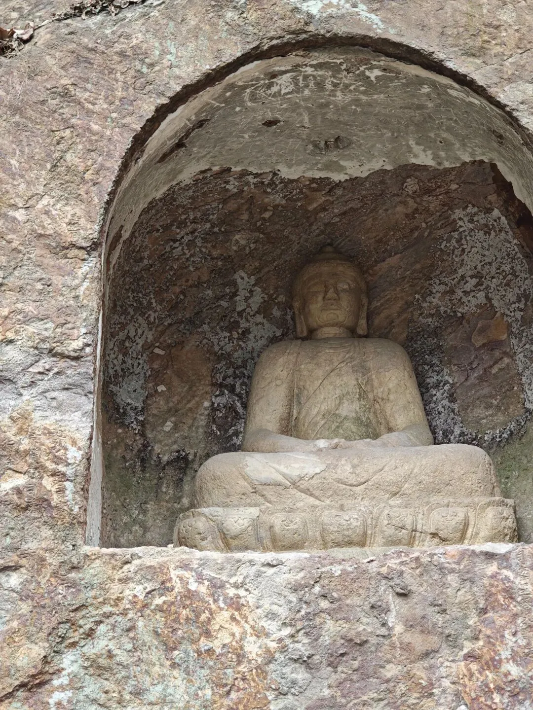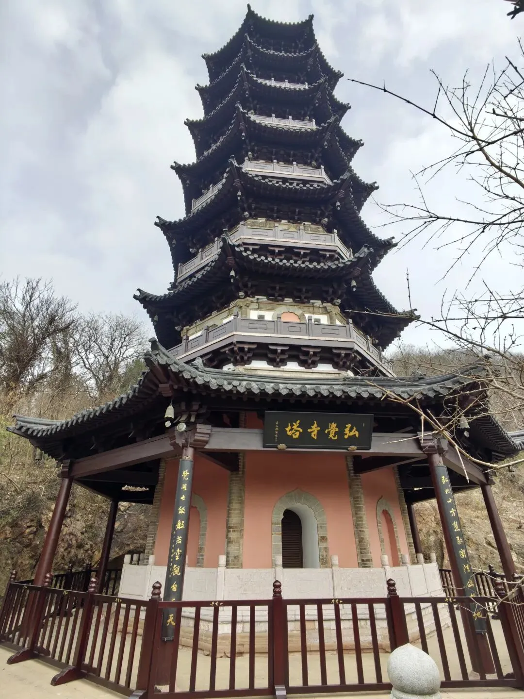 殿内中心是一座高达21.8米的舍利大塔,塔中安奉着佛顶骨舍利(通常仅在特定佛教节日公开瞻礼)。顶部中心的天眼更是透着淡蓝色神秘的光泽,四周的墙壁和穹顶布满精美的佛像、浮雕和壁画,宛如进入了极乐世界。佛顶骨舍利是全世界目前唯一发现的释迦牟尼佛顶骨真身舍利,是佛教无上圣物。佛顶宫因此成为了世界级的佛教圣地之一,具有了极其崇高的宗教地位和文化价值。反复在千佛殿走过,殿内空间并未很大,360度空间中的每一寸都是艺术的精华,沿顺时针方向一一拜过。整个空间充斥着金色、红色、蓝色、绿色等饱和度极高的色彩,晕染的整个空间富丽堂皇,恍若在极乐世界中。环绕着千佛殿有一条长长的回廊,称为万佛廊,同样装饰着数以万计的佛龛与造像,艺术价值也极高。在这里从廊柱,到地砖,从灯光,到墙面,几乎是所有空间,都是各种佛教艺术形式的展示。虽无法一一说清材质、制作工艺,一一走过看过,也是一次一次的被东方美学深深的折服着。一切都美轮美奂,这还能用什么词汇来表达呢,也只能是贪婪的单向吸收着。透过每一尊佛像,它的神韵或给人以慈悲、或给人以智慧、或给人以宁静、或给人以崇高。受此洗礼,心情也变的安静平和。在万佛廊俯瞰千佛殿,站在高处,又看到了不同角度更多的美好,也是将在底层时需仰望看到的景物,用平视来体验,看的也更真切些,众佛陀多维度普度众生。万佛廊很长,这也更有幸在艺术的长廊中能多领略些其中的千变万化。出佛顶宫,看到有上山路可供上山游览,附近也有商业街供应餐食,餐食都是素食,味道也一般。接下来就是登临和佛顶宫相邻的佛顶塔,塔高共九级,可攀爬最高七级。登高望远在此可眺望佛顶宫全貌、牛头禅院、弘觉寺塔及牛首山的自然山水和临近城市市貌。佛顶塔每一层都有不同材质,不同佛教故事的壁画、浮雕,在第六层供奉有一口大钟。佛顶塔为现代仿唐代楼阁式塔,高约88米,九级四面,斗拱宏大,出檐深远。与佛顶塔相临为牛头禅院,牛头禅院内,房舍典雅,植被茂密,最显著站C位的建筑当属弘觉寺塔,这是一座唐代古塔复修于明代。现代仿古的佛顶塔和历史久远的弘觉寺塔彼此相望,可谓是新塔古塔交相辉映。登小山头进入牛头禅院,院落不大,一进院,弘觉寺塔赫然在立,这座塔也是牛首山现存最古老、最珍贵的文物建筑,是真正的千年古塔。原为牛首山弘觉寺的附属建筑。弘觉寺正是唐代牛头禅宗祖庭的核心寺院,法融禅师曾在此弘法。因此,这座塔直接关联着牛首山最辉煌的佛教时期——牛头宗祖庭时代。穿过长廊,就可立于弘觉寺塔前。塔前没有路,只有一些植物相随。剥开植物枝条,站于塔正面,静静仰视古塔,和这座千年古塔默然相对,感受着它的古朴、原真、沧桑。和古塔走过的岁月来一段内心的对话。弘觉寺塔是一座七级八面的砖木结构楼阁式塔,是典型的明代塔建筑风格。现塔身保存基本完好,但塔内的木结构楼梯、腰檐等已在岁月中损毁,因此目前不能登临。完全以“素颜”状态展示着。南京的早梅也已迫不及待的露出红颜,还想着能看看南京梅花山的梅花盛景,因时间限制不可得,没想到在牛首山竟然也圆了一点心愿,看到了刚刚绽放的早梅。出牛头禅院找到徒步山路,决定徒步下山,冬日的牛首山,山中的植物大都也还保留有绿色,这也是和北方的山体大不同处,南京和济南虽只是3个小时的车程差距,但植物绿色的覆盖程度要大的多。早开的梅花虽还未成规模,偶尔的一树红色则更是山体的点缀,好看。路经“朝天阙”牌坊,这个牌坊名提示着这是一条朝拜之路,这个牌坊也徒步路线的一个重要景观。途经“明代摩崖石刻”。石刻位于牛首山东峰兜率岩前,三面岩壁上共凿有133尊石像,据考证为明代开凿。这一片也就被称为明代摩崖石刻,这也是徒步路上的一处风景,也是牛首山佛教历史的见证。在徒步路中每隔一段,就有一位牛头宗师的塑像,通过他们的介绍也可更进一步了解牛首山佛教的渊源。接下来会走到岳飞抗金故垒,也是很感慨当年的北方民族已经这么深入中原了。故垒遗址位于牛首山东麓,现存部分土垒、壕沟遗迹,长约数公里。虽历经风雨侵蚀,但轮廓仍可辨识。