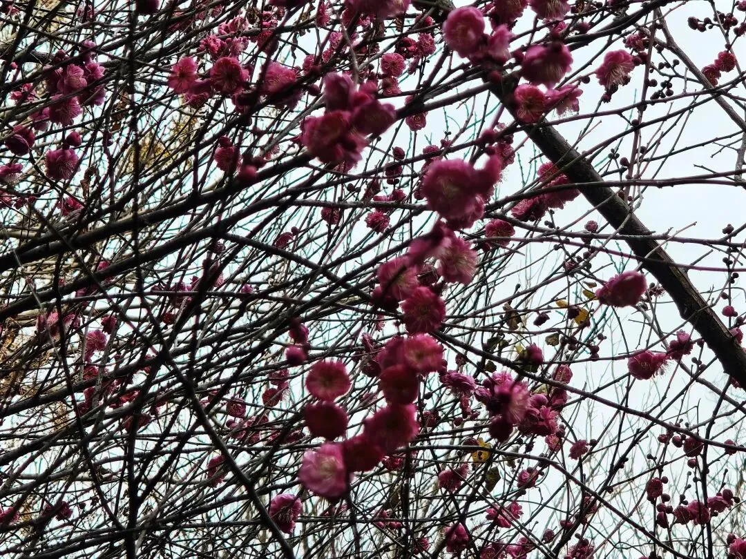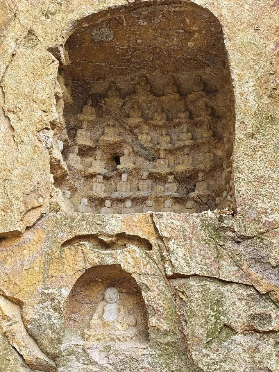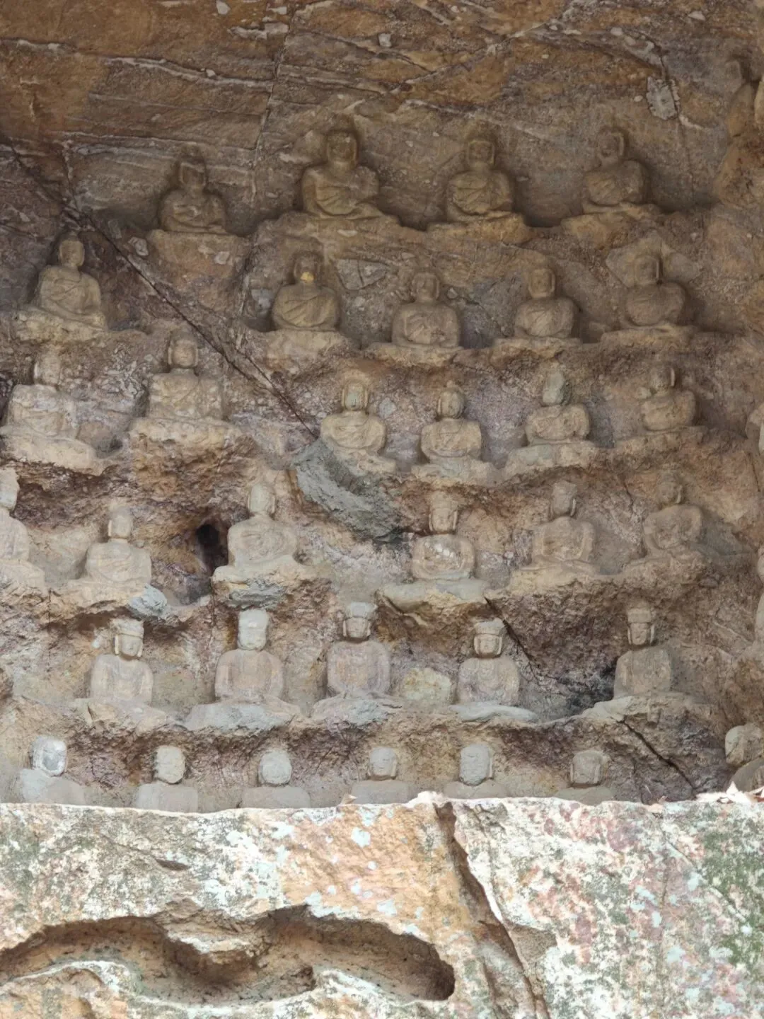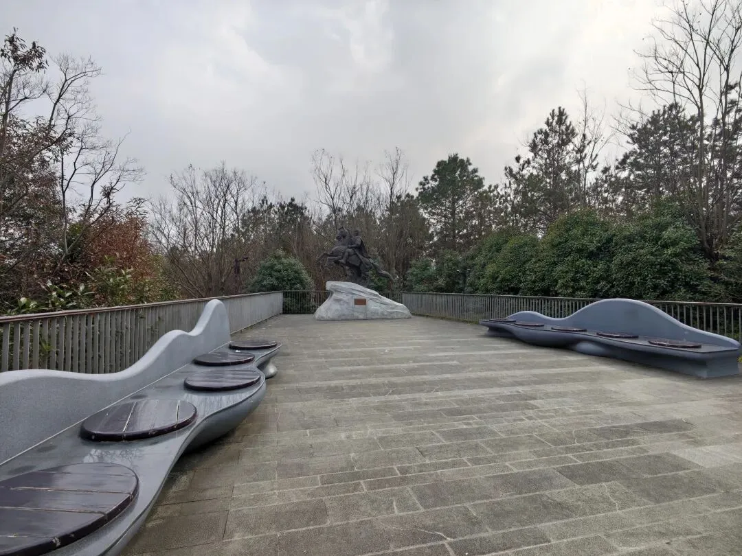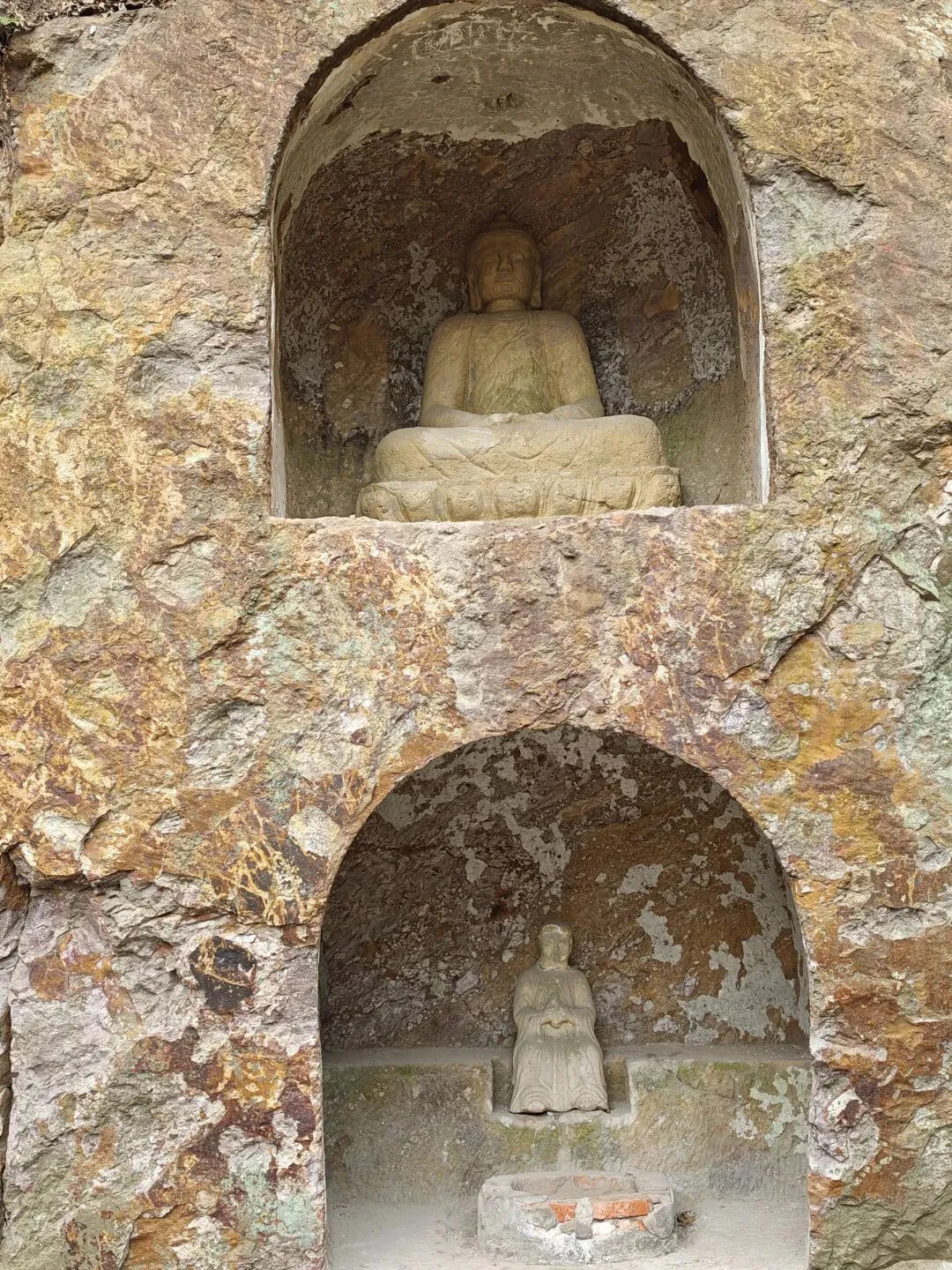 殿内中心是一座高达21.8米的舍利大塔,塔中安奉着佛顶骨舍利(通常仅在特定佛教节日公开瞻礼)。顶部中心的天眼更是透着淡蓝色神秘的光泽,四周的墙壁和穹顶布满精美的佛像、浮雕和壁画,宛如进入了极乐世界。佛顶骨舍利是全世界目前唯一发现的释迦牟尼佛顶骨真身舍利,是佛教无上圣物。佛顶宫因此成为了世界级的佛教圣地之一,具有了极其崇高的宗教地位和文化价值。反复在千佛殿走过,殿内空间并未很大,360度空间中的每一寸都是艺术的精华,沿顺时针方向一一拜过。整个空间充斥着金色、红色、蓝色、绿色等饱和度极高的色彩,晕染的整个空间富丽堂皇,恍若在极乐世界中。环绕着千佛殿有一条长长的回廊,称为万佛廊,同样装饰着数以万计的佛龛与造像,艺术价值也极高。在这里从廊柱,到地砖,从灯光,到墙面,几乎是所有空间,都是各种佛教艺术形式的展示。虽无法一一说清材质、制作工艺,一一走过看过,也是一次一次的被东方美学深深的折服着。一切都美轮美奂,这还能用什么词汇来表达呢,也只能是贪婪的单向吸收着。透过每一尊佛像,它的神韵或给人以慈悲、或给人以智慧、或给人以宁静、或给人以崇高。受此洗礼,心情也变的安静平和。在万佛廊俯瞰千佛殿,站在高处,又看到了不同角度更多的美好,也是将在底层时需仰望看到的景物,用平视来体验,看的也更真切些,众佛陀多维度普度众生。万佛廊很长,这也更有幸在艺术的长廊中能多领略些其中的千变万化。出佛顶宫,看到有上山路可供上山游览,附近也有商业街供应餐食,餐食都是素食,味道也一般。接下来就是登临和佛顶宫相邻的佛顶塔,塔高共九级,可攀爬最高七级。登高望远在此可眺望佛顶宫全貌、牛头禅院、弘觉寺塔及牛首山的自然山水和临近城市市貌。佛顶塔每一层都有不同材质,不同佛教故事的壁画、浮雕,在第六层供奉有一口大钟。佛顶塔为现代仿唐代楼阁式塔,高约88米,九级四面,斗拱宏大,出檐深远。与佛顶塔相临为牛头禅院,牛头禅院内,房舍典雅,植被茂密,最显著站C位的建筑当属弘觉寺塔,这是一座唐代古塔复修于明代。现代仿古的佛顶塔和历史久远的弘觉寺塔彼此相望,可谓是新塔古塔交相辉映。登小山头进入牛头禅院,院落不大,一进院,弘觉寺塔赫然在立,这座塔也是牛首山现存最古老、最珍贵的文物建筑,是真正的千年古塔。原为牛首山弘觉寺的附属建筑。弘觉寺正是唐代牛头禅宗祖庭的核心寺院,法融禅师曾在此弘法。因此,这座塔直接关联着牛首山最辉煌的佛教时期——牛头宗祖庭时代。穿过长廊,就可立于弘觉寺塔前。塔前没有路,只有一些植物相随。剥开植物枝条,站于塔正面,静静仰视古塔,和这座千年古塔默然相对,感受着它的古朴、原真、沧桑。和古塔走过的岁月来一段内心的对话。弘觉寺塔是一座七级八面的砖木结构楼阁式塔,是典型的明代塔建筑风格。现塔身保存基本完好,但塔内的木结构楼梯、腰檐等已在岁月中损毁,因此目前不能登临。完全以“素颜”状态展示着。南京的早梅也已迫不及待的露出红颜,还想着能看看南京梅花山的梅花盛景,因时间限制不可得,没想到在牛首山竟然也圆了一点心愿,看到了刚刚绽放的早梅。出牛头禅院找到徒步山路,决定徒步下山,冬日的牛首山,山中的植物大都也还保留有绿色,这也是和北方的山体大不同处,南京和济南虽只是3个小时的车程差距,但植物绿色的覆盖程度要大的多。早开的梅花虽还未成规模,偶尔的一树红色则更是山体的点缀,好看。路经“朝天阙”牌坊,这个牌坊名提示着这是一条朝拜之路,这个牌坊也徒步路线的一个重要景观。途经“明代摩崖石刻”。石刻位于牛首山东峰兜率岩前,三面岩壁上共凿有133尊石像,据考证为明代开凿。这一片也就被称为明代摩崖石刻,这也是徒步路上的一处风景,也是牛首山佛教历史的见证。在徒步路中每隔一段,就有一位牛头宗师的塑像,通过他们的介绍也可更进一步了解牛首山佛教的渊源。接下来会走到岳飞抗金故垒,也是很感慨当年的北方民族已经这么深入中原了。故垒遗址位于牛首山东麓,现存部分土垒、壕沟遗迹,长约数公里。虽历经风雨侵蚀,但轮廓仍可辨识。