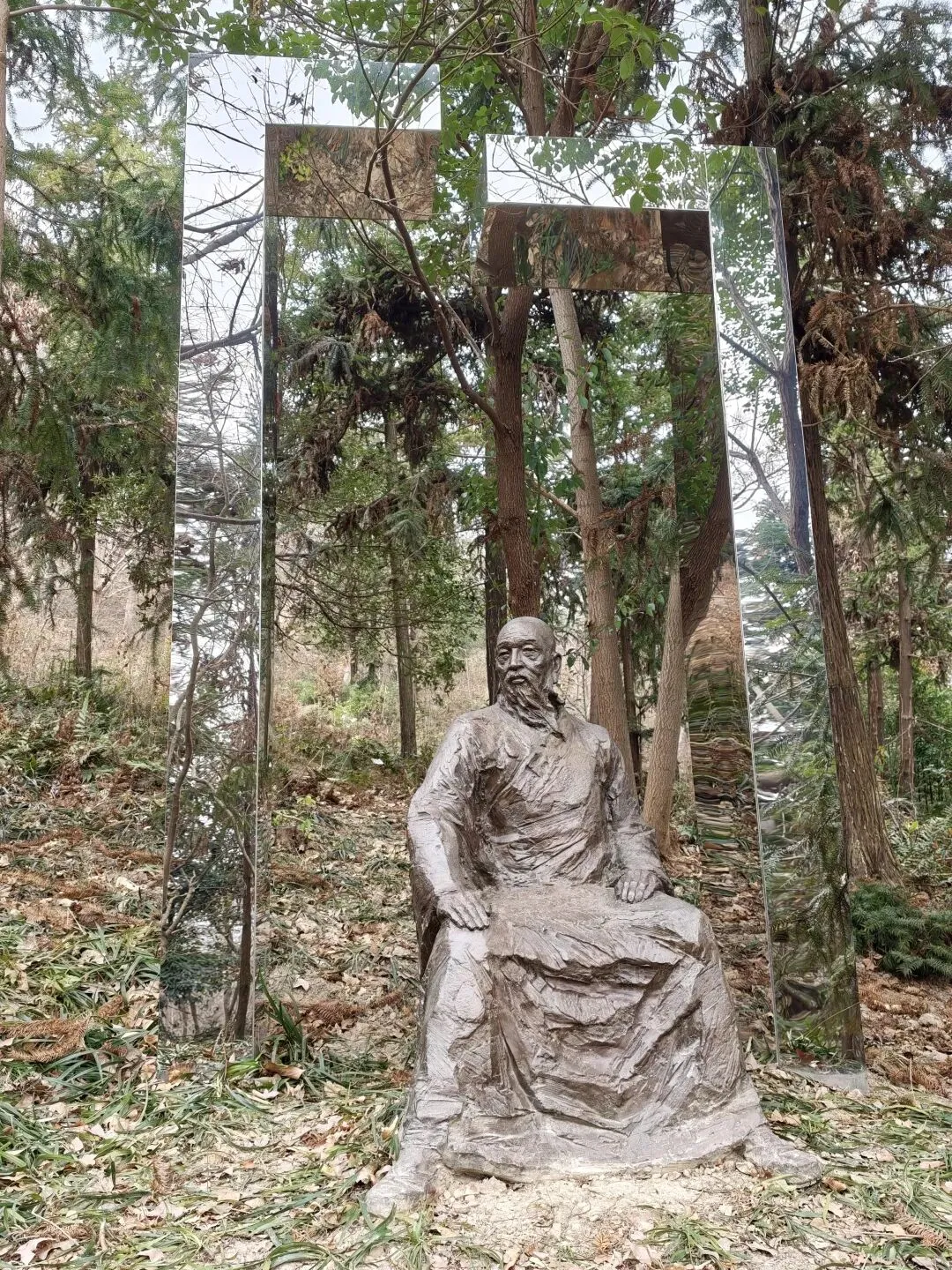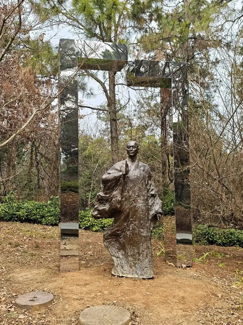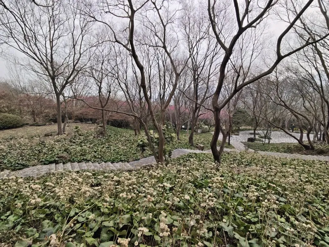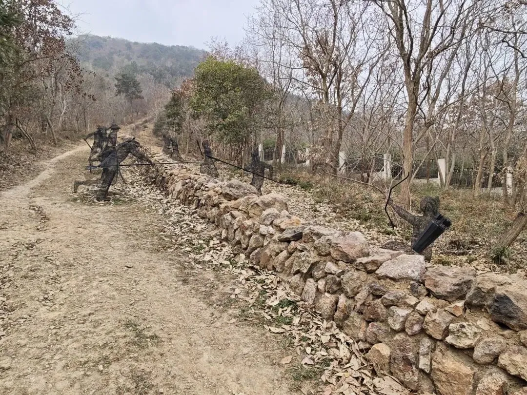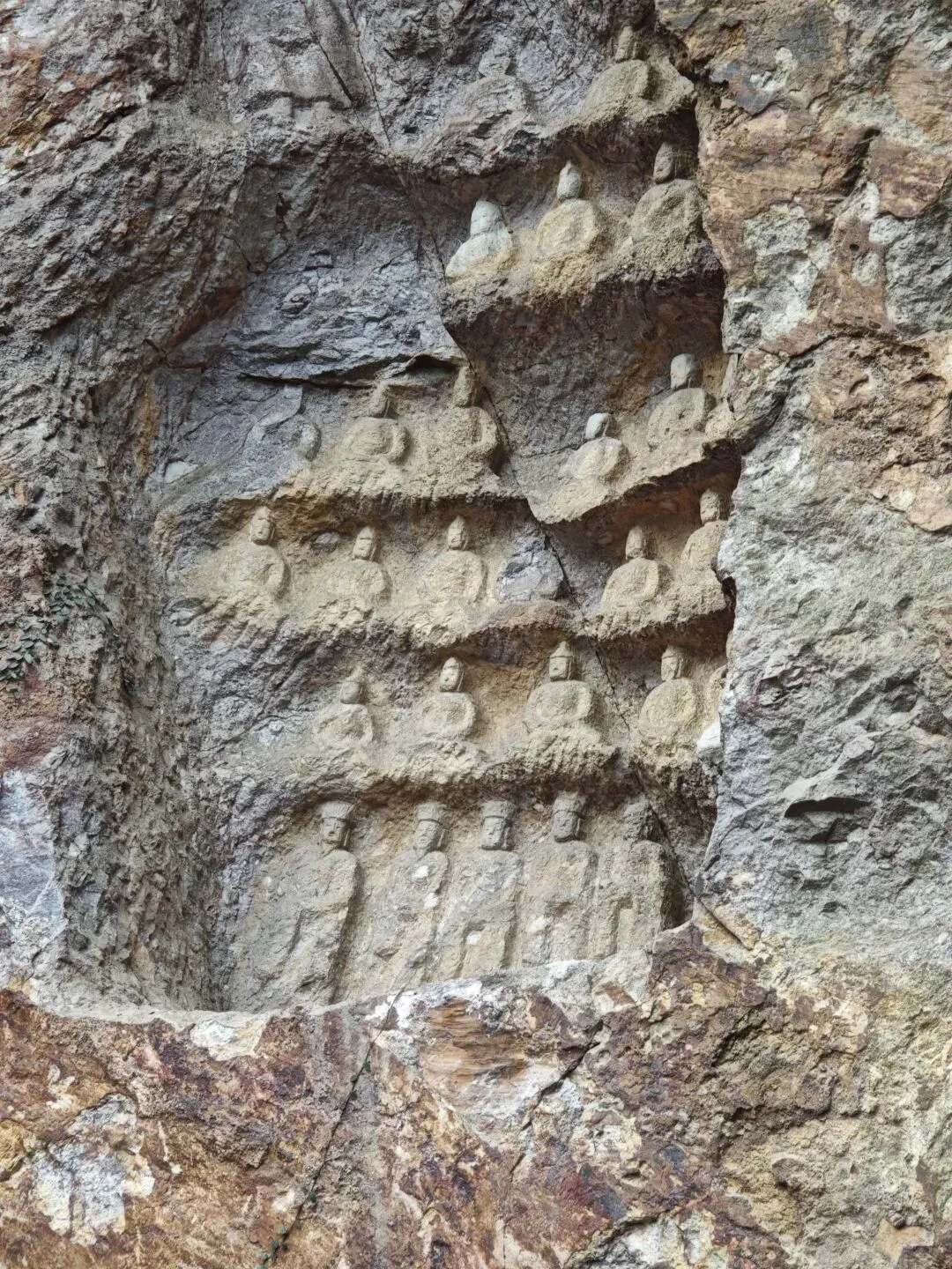 殿内中心是一座高达21.8米的舍利大塔,塔中安奉着佛顶骨舍利(通常仅在特定佛教节日公开瞻礼)。顶部中心的天眼更是透着淡蓝色神秘的光泽,四周的墙壁和穹顶布满精美的佛像、浮雕和壁画,宛如进入了极乐世界。佛顶骨舍利是全世界目前唯一发现的释迦牟尼佛顶骨真身舍利,是佛教无上圣物。佛顶宫因此成为了世界级的佛教圣地之一,具有了极其崇高的宗教地位和文化价值。反复在千佛殿走过,殿内空间并未很大,360度空间中的每一寸都是艺术的精华,沿顺时针方向一一拜过。整个空间充斥着金色、红色、蓝色、绿色等饱和度极高的色彩,晕染的整个空间富丽堂皇,恍若在极乐世界中。环绕着千佛殿有一条长长的回廊,称为万佛廊,同样装饰着数以万计的佛龛与造像,艺术价值也极高。在这里从廊柱,到地砖,从灯光,到墙面,几乎是所有空间,都是各种佛教艺术形式的展示。虽无法一一说清材质、制作工艺,一一走过看过,也是一次一次的被东方美学深深的折服着。一切都美轮美奂,这还能用什么词汇来表达呢,也只能是贪婪的单向吸收着。透过每一尊佛像,它的神韵或给人以慈悲、或给人以智慧、或给人以宁静、或给人以崇高。受此洗礼,心情也变的安静平和。在万佛廊俯瞰千佛殿,站在高处,又看到了不同角度更多的美好,也是将在底层时需仰望看到的景物,用平视来体验,看的也更真切些,众佛陀多维度普度众生。万佛廊很长,这也更有幸在艺术的长廊中能多领略些其中的千变万化。出佛顶宫,看到有上山路可供上山游览,附近也有商业街供应餐食,餐食都是素食,味道也一般。接下来就是登临和佛顶宫相邻的佛顶塔,塔高共九级,可攀爬最高七级。登高望远在此可眺望佛顶宫全貌、牛头禅院、弘觉寺塔及牛首山的自然山水和临近城市市貌。佛顶塔每一层都有不同材质,不同佛教故事的壁画、浮雕,在第六层供奉有一口大钟。佛顶塔为现代仿唐代楼阁式塔,高约88米,九级四面,斗拱宏大,出檐深远。与佛顶塔相临为牛头禅院,牛头禅院内,房舍典雅,植被茂密,最显著站C位的建筑当属弘觉寺塔,这是一座唐代古塔复修于明代。现代仿古的佛顶塔和历史久远的弘觉寺塔彼此相望,可谓是新塔古塔交相辉映。登小山头进入牛头禅院,院落不大,一进院,弘觉寺塔赫然在立,这座塔也是牛首山现存最古老、最珍贵的文物建筑,是真正的千年古塔。原为牛首山弘觉寺的附属建筑。弘觉寺正是唐代牛头禅宗祖庭的核心寺院,法融禅师曾在此弘法。因此,这座塔直接关联着牛首山最辉煌的佛教时期——牛头宗祖庭时代。穿过长廊,就可立于弘觉寺塔前。塔前没有路,只有一些植物相随。剥开植物枝条,站于塔正面,静静仰视古塔,和这座千年古塔默然相对,感受着它的古朴、原真、沧桑。和古塔走过的岁月来一段内心的对话。弘觉寺塔是一座七级八面的砖木结构楼阁式塔,是典型的明代塔建筑风格。现塔身保存基本完好,但塔内的木结构楼梯、腰檐等已在岁月中损毁,因此目前不能登临。完全以“素颜”状态展示着。南京的早梅也已迫不及待的露出红颜,还想着能看看南京梅花山的梅花盛景,因时间限制不可得,没想到在牛首山竟然也圆了一点心愿,看到了刚刚绽放的早梅。出牛头禅院找到徒步山路,决定徒步下山,冬日的牛首山,山中的植物大都也还保留有绿色,这也是和北方的山体大不同处,南京和济南虽只是3个小时的车程差距,但植物绿色的覆盖程度要大的多。早开的梅花虽还未成规模,偶尔的一树红色则更是山体的点缀,好看。路经“朝天阙”牌坊,这个牌坊名提示着这是一条朝拜之路,这个牌坊也徒步路线的一个重要景观。途经“明代摩崖石刻”。石刻位于牛首山东峰兜率岩前,三面岩壁上共凿有133尊石像,据考证为明代开凿。这一片也就被称为明代摩崖石刻,这也是徒步路上的一处风景,也是牛首山佛教历史的见证。在徒步路中每隔一段,就有一位牛头宗师的塑像,通过他们的介绍也可更进一步了解牛首山佛教的渊源。接下来会走到岳飞抗金故垒,也是很感慨当年的北方民族已经这么深入中原了。故垒遗址位于牛首山东麓,现存部分土垒、壕沟遗迹,长约数公里。虽历经风雨侵蚀,但轮廓仍可辨识。