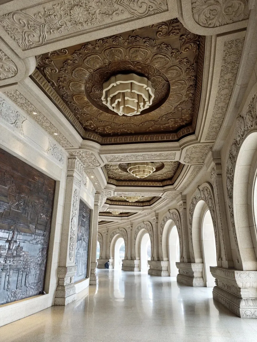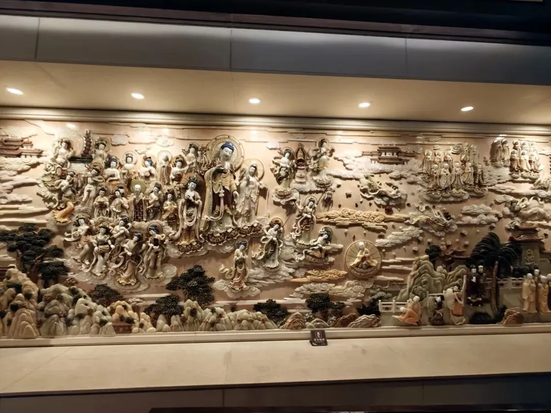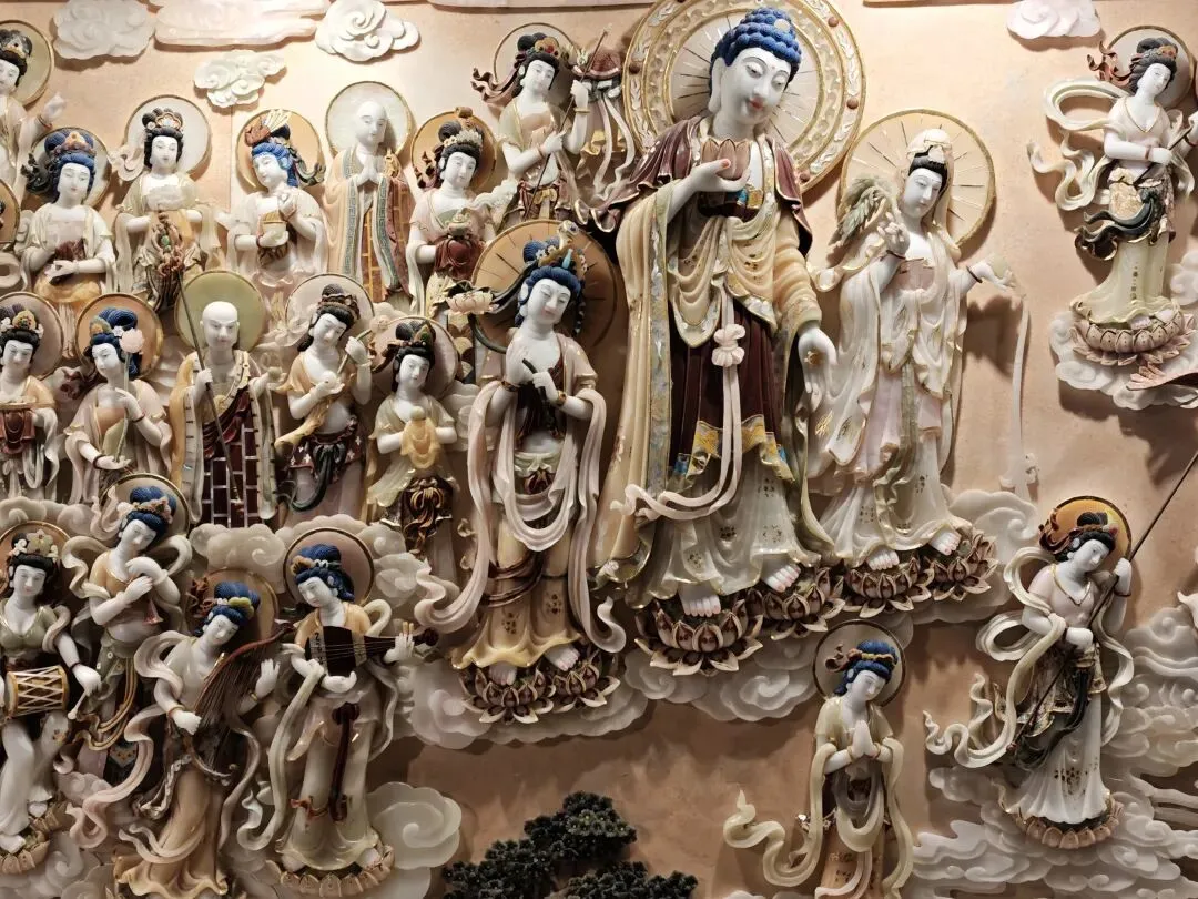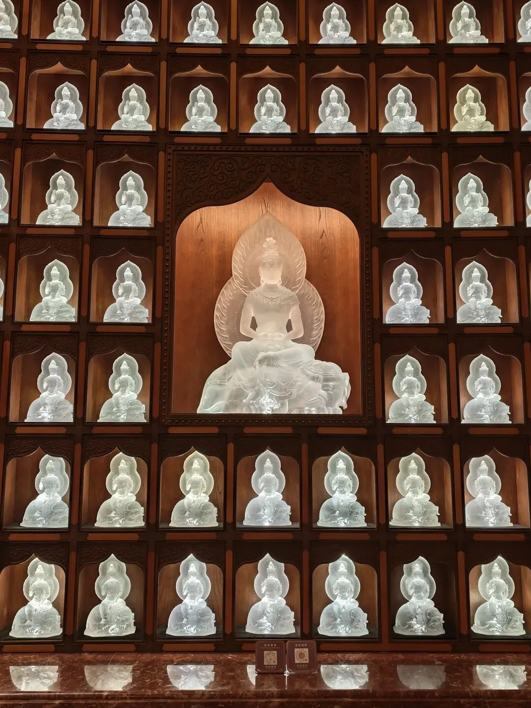墙体上装饰用灯光中也能隐隐看出是一尊尊佛陀形成的灯带。在这里,各种形式的佛教元素弥漫在不可想象的空间中,既是信仰,又是艺术。玉体雕刻的巨型艺术品,给与身心极大的享受,看色彩,人物,衣裙,表情,体态,配饰,看多种玉质的叠加,心中也是给与匠人们最大的崇敬。前往地下宫殿(舍利藏宫), 这是佛顶宫最神圣、最精华的部分,需乘坐扶梯深入地下。