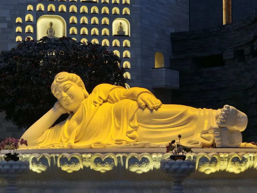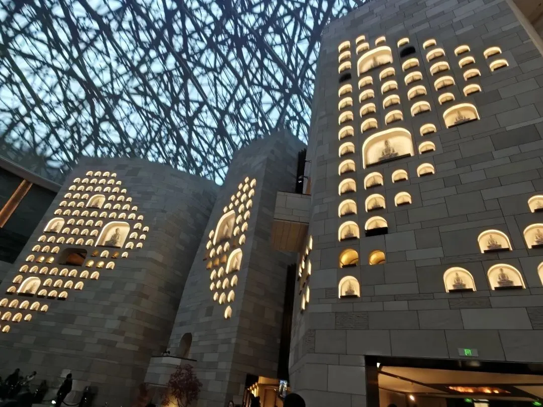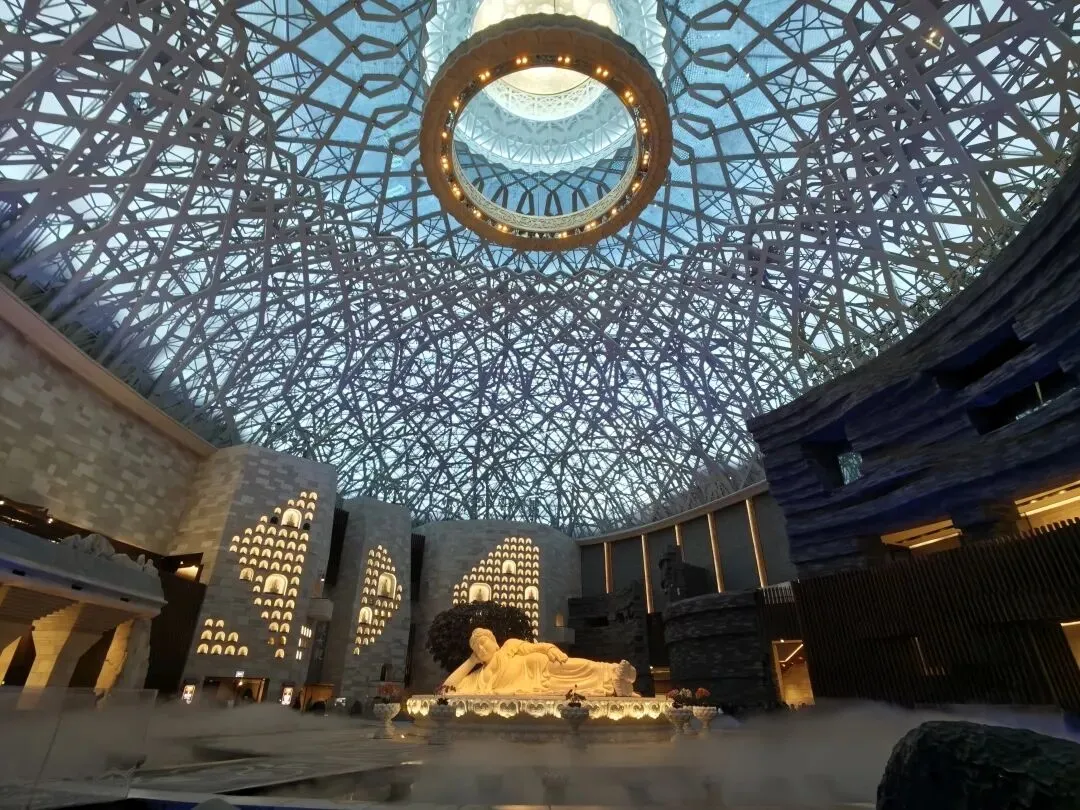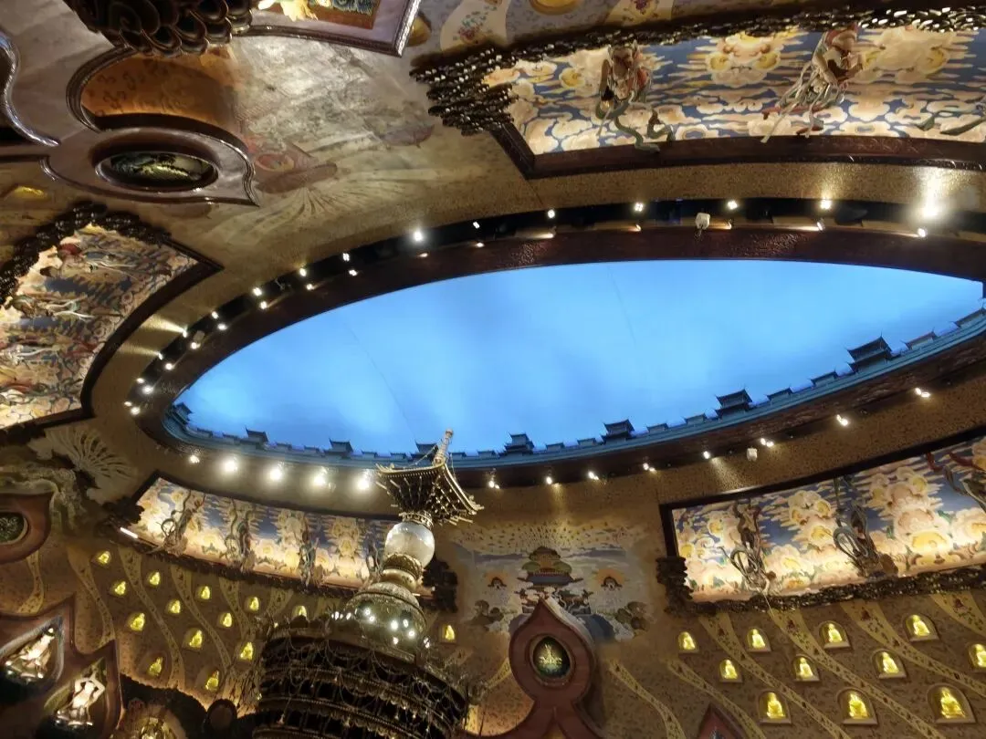 先是进入禅境大观的360度回廊中,一踏入,内中豪华典雅的装饰就让人目不暇接,看到的每一寸空间无不弥漫着艺术的气息,而且是多重艺术形式。这还只是令人震撼的序曲,以后的每一步,都是在极度美妙的体验中度过的。在佛顶宫游览的2个小时中,眼睛是一直在天堂中的。进入禅境大厅,光线顿觉暗下来,营造出蓝色的底色,只见中间一尊白玉卧佛徐徐旋转着,空中萦绕着低沉的梵音,让人顿生肃穆敬仰之心。整个大厅色彩和禅意氛围的营造主要来自穹顶仿星空的LED屏,色彩会随着季节和时辰变化。卧佛周围是硕大的如莲剧场,剧场可升降,可旋转,可打开,可合拢,周围隐藏有36片莲花瓣,花瓣开起时将形成一朵巨型莲花,花开见佛。科技与艺术在这里完美的融合在一起。